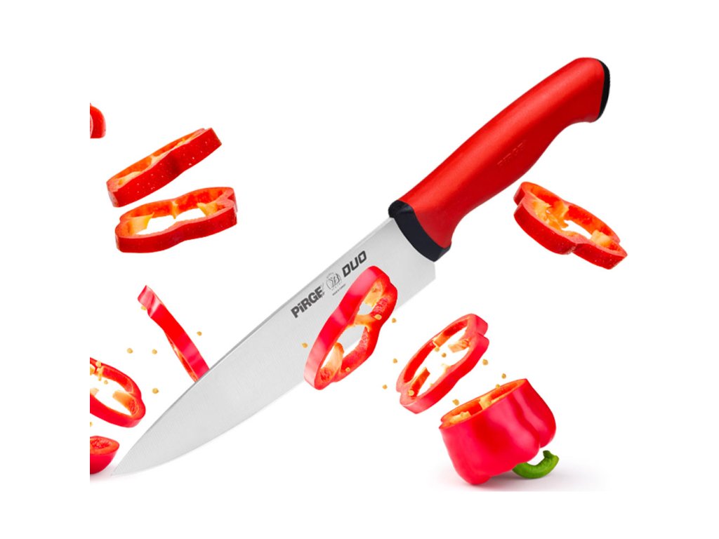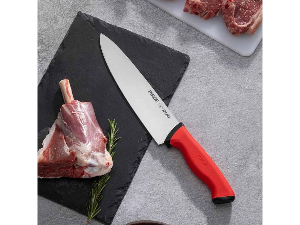 Všestranný řeznický nůž Chef ze série Pirge DUO Butcher z nerezové oceli X50CrMoV15. Nůž na maso a pro běžné krájení. Ergonomická červená rukojeť je vyrobena z polypropylenu (PPC) s povrchem z TPE. Délka ostří 210 mm.