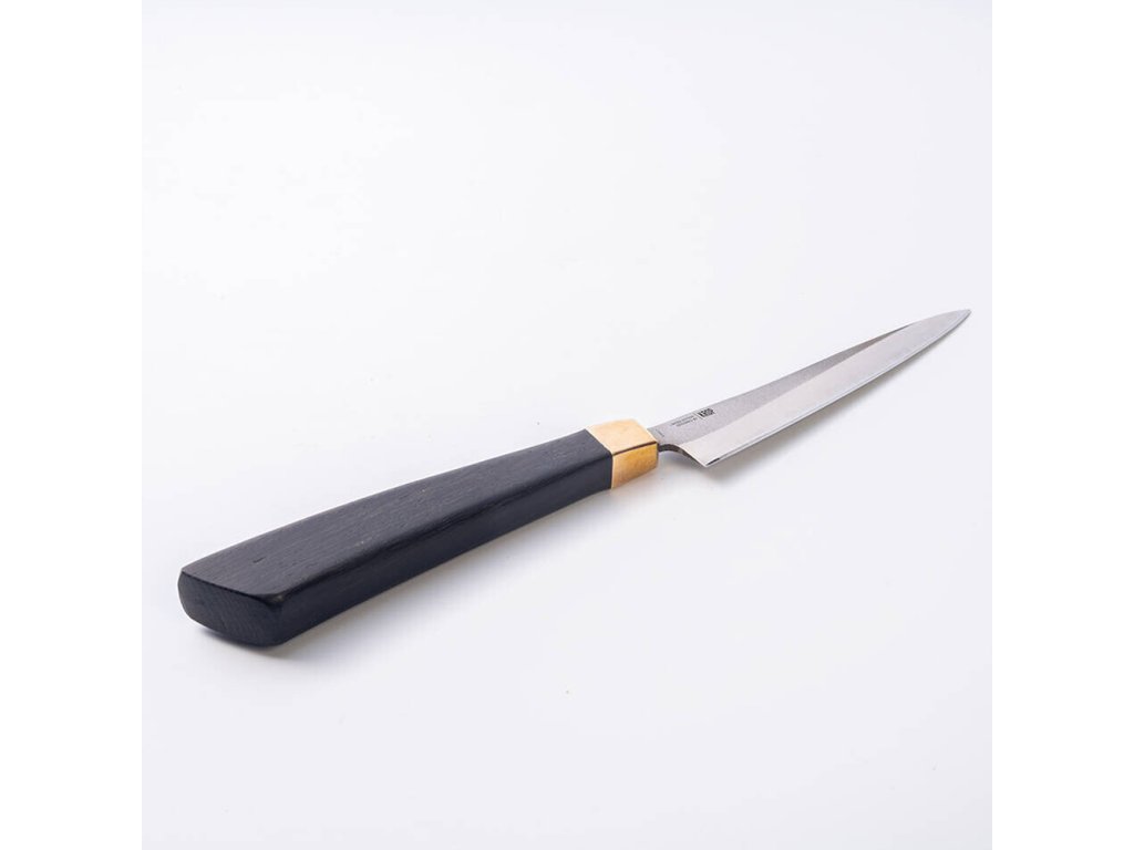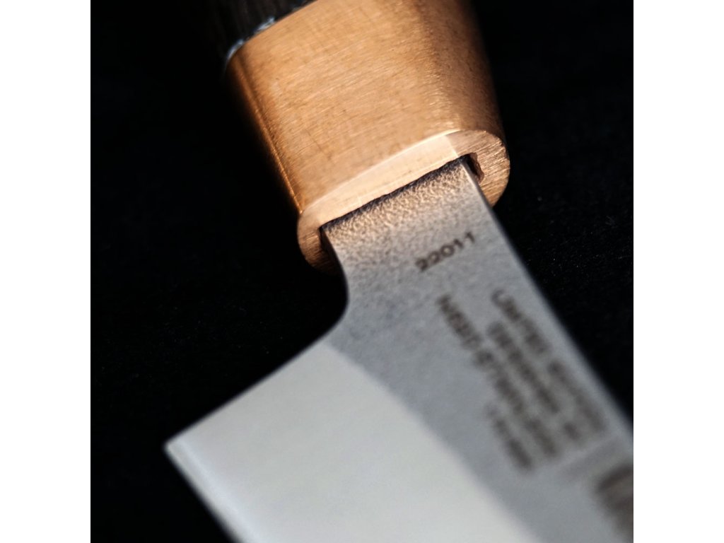 Rukojeť je vyrobena z fosilizovaného dřeva 1500 let starého vodního dubu a doplněna mosazným bolstrem. Ten s časem získá jedinečnou patinu, která mu dodá elegantní, lehce ošuntělý a starožitný vzhled. Nůž tak s postupem let získá osobitý charakter a stane se vaším věrným společníkem, jako starý přítel.