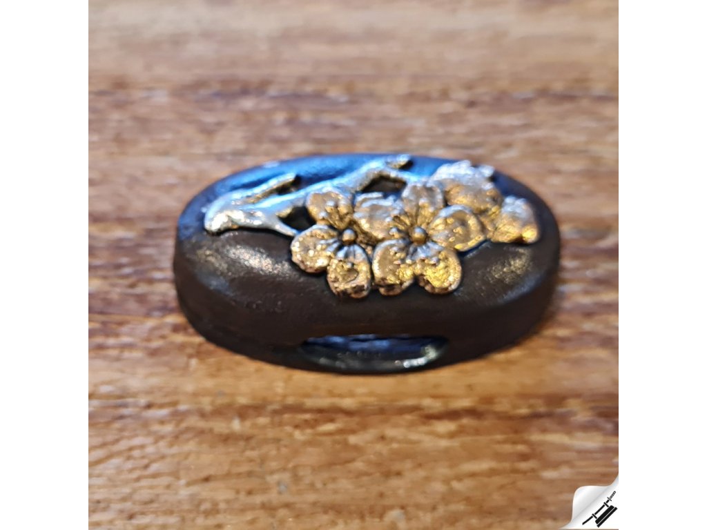 Ručně zdobená dekorativní sada koshirae s jemným motivem rozkvetlé třešně (sakura) v tradičním japonském stylu. Obsahuje tsubu, fuchi a kashiru s detailními květy ve zlaté a stříbrné patině. Ideální pro oživení katany nebo jako sběratelský kousek s vysokou uměleckou hodnotou.