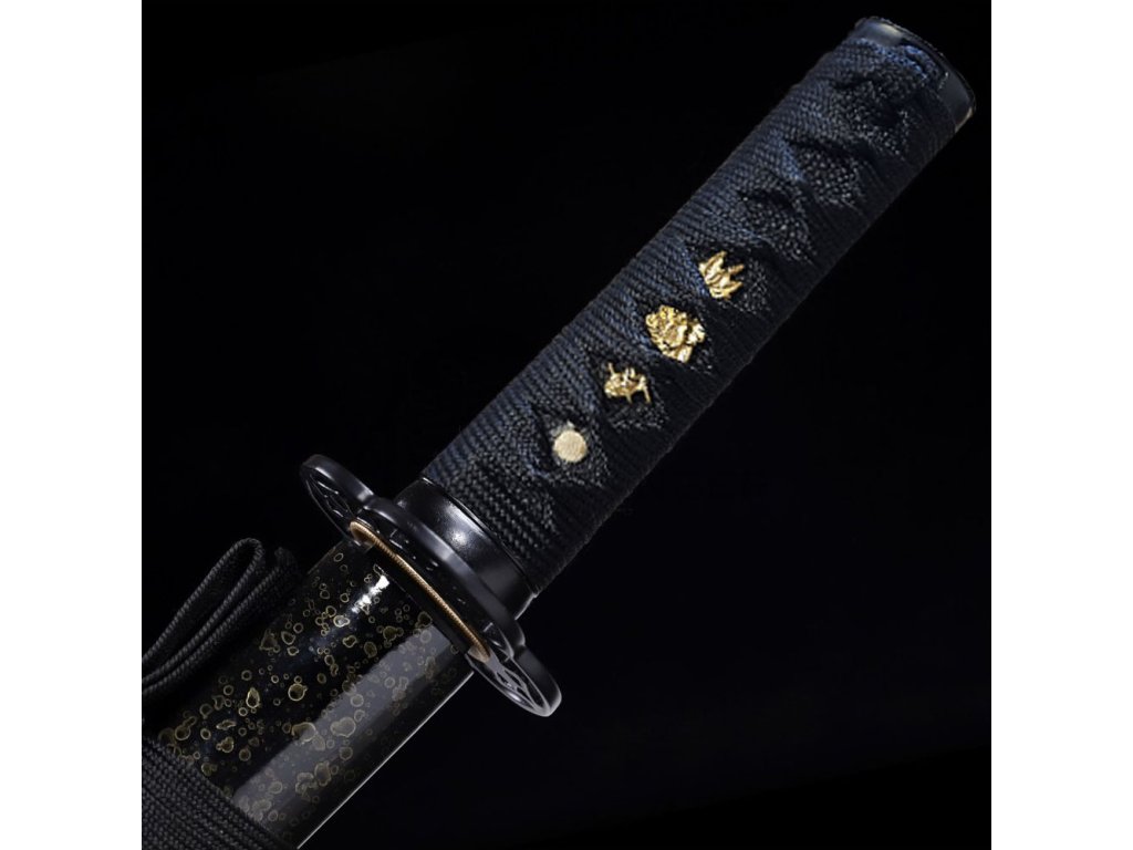 Luxusní funkční replika tanto Kuro Hebi s čepelí z prémiové uhlíkové oceli T-10 disponuje reálným hamonem Choji a vysokou tvrdostí 58 HRC. Čepel o délce 33,3 cm (1,10 Shaku) je zasazena do rukojeti potažené pravou rejnočí kůží s dekorativními zlatými menuki. Výjimečným prvkem je lesklá černá saya se zlatým vzorem v tradičním stylu urushi, doplněná hedvábným opletem sageo. Toto tanto je ideální volbou pro náročné sběratele i pro aktivní nácvik technik bojových umění.