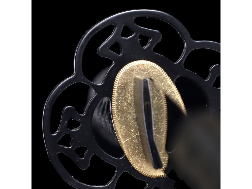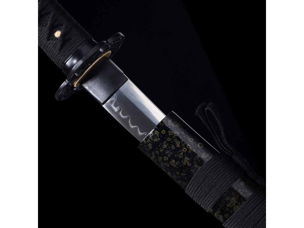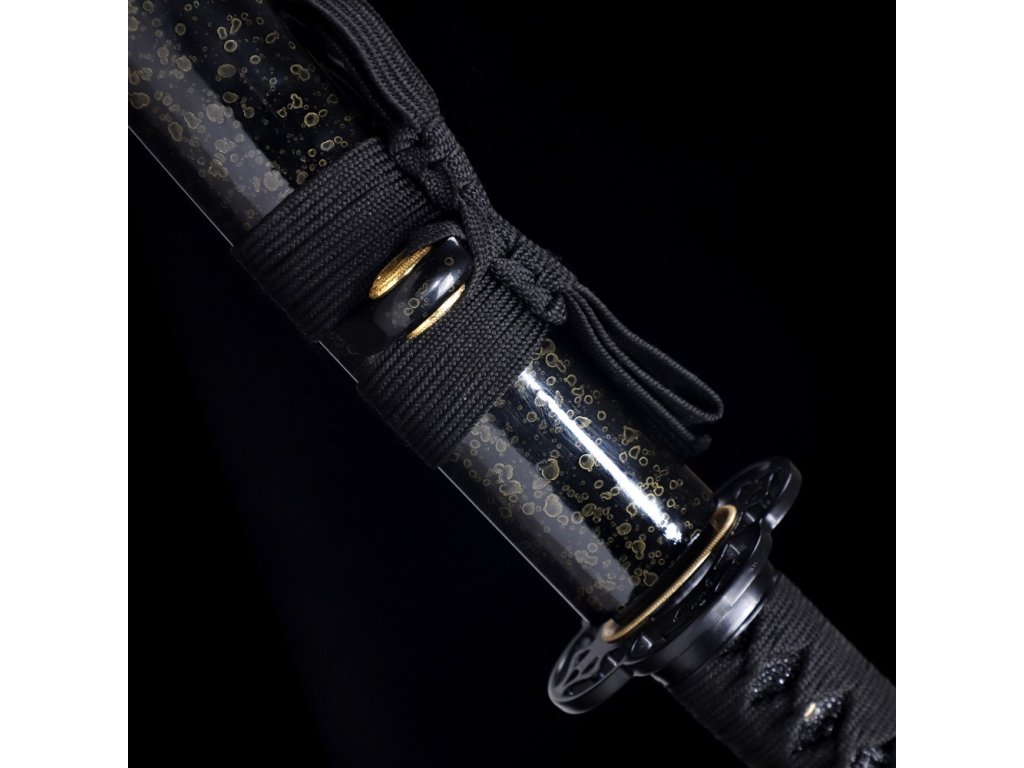 Kované ostré elegantní tanto Kuro Hebi představuje špičkovou kombinaci funkčnosti a japonského dekorativního umění. Čepel je vyrobena z vysoce kvalitní uhlíkové oceli T-10 a díky parciálnímu kalení nese autentický Choji hamon. S tvrdostí 58 HRC a konstrukcí full-tang je tento nůž připraven na aktivní nácvik bojových umění. Dominantou meče je černá lesklá saya se zlatým vzorem připomínajícím jemné bublinky v laku, vytvořená v tradičním stylu urushi.