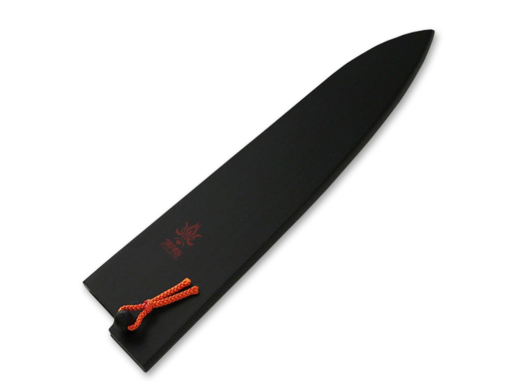 Přírodní dřevěná pochva pro nůž Gyuto. Dřevěné pouzdro Saya je perfektní ochranou pro nože. Je z měkkého dřeva, odolná vůči vlhkosti a neobsahuje žádné pryskyřice. Kryt/Saya vám pomůže zabránit poškození nožů během přepravy. Sayu doporučujeme všem zákazníkům, kteří často přenáší nože.