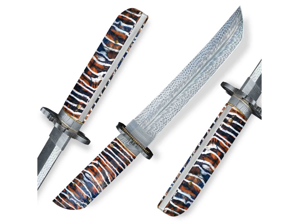Jedná se o unikátní nůž Tanto s ručně vyrobenou čepelí z damaškové oceli vyráběné v USA a to konkrétně od Randy Feather Damascus. Každý nůž je individuálně ručně broušen a dosahuje neuvěřitelné až extrémní ostrosti. Střenka (tsuka) je zdobená broušenou fosilií mamutího zubu, a ochranné prvky (tsuba a habaki) jsou z damaškové oceli. Kombinace mamutí fosilie a krásné kresby damašku od Randyho Feathra tvoří dokonalý pár, čímž konečný výsledek působí naprosto uchvacujícím dojmem. Více než 10 000 let stará fosilie mamutího zubu byla objevena na území Sibiře, což činí tento materiál vzácným a okouzlujícím. Při pouhém dotyku pocítíte poslední odkaz legendárního stvoření, které putovalo po Zemi na úsvitu lidstva.