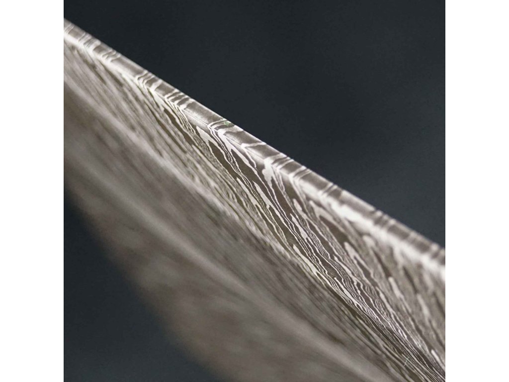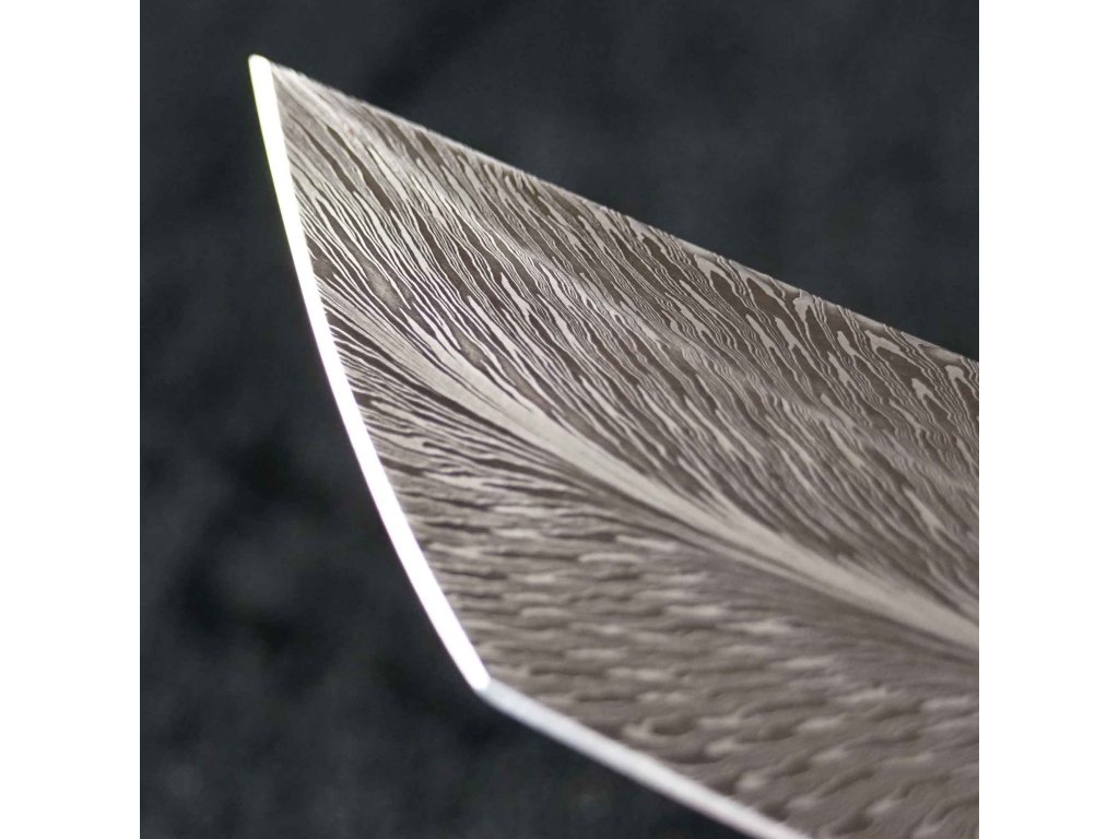 Exkluzivní damaškový nůž tanto s nádhernou čepelí z damaškové oceli Feather Damascus. Střenka z více než 10 000 let staré fosilie mamutího zubu dělá z každého kusu originál. Precizní ruční broušení zajišťuje extrémní ostrost. Luxusní sběratelský kousek, včetně stylového koženého pouzdra. Nůž nr. 2.