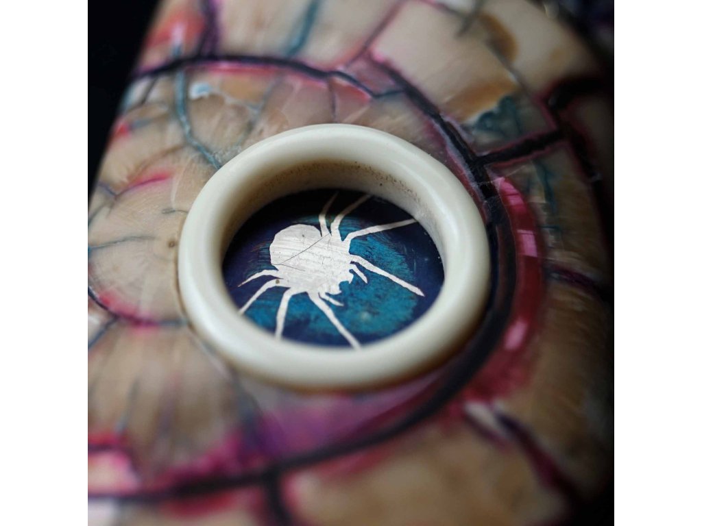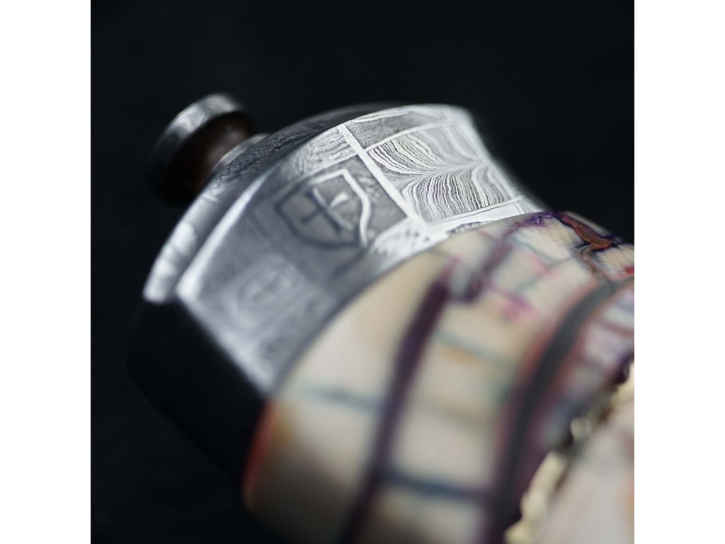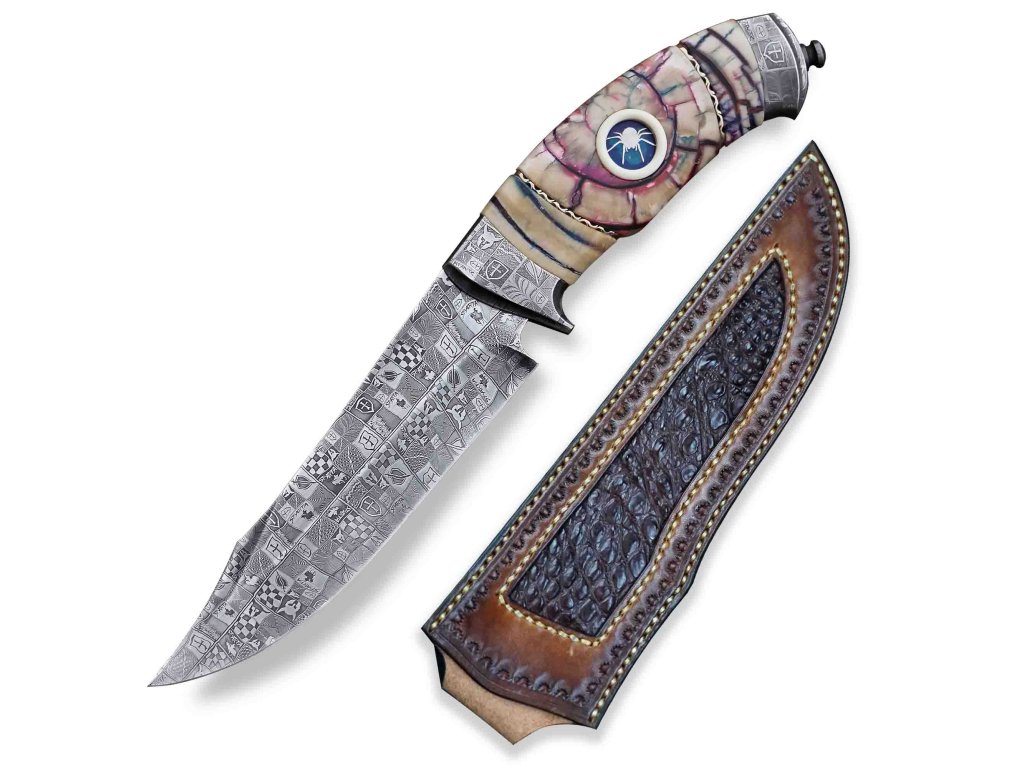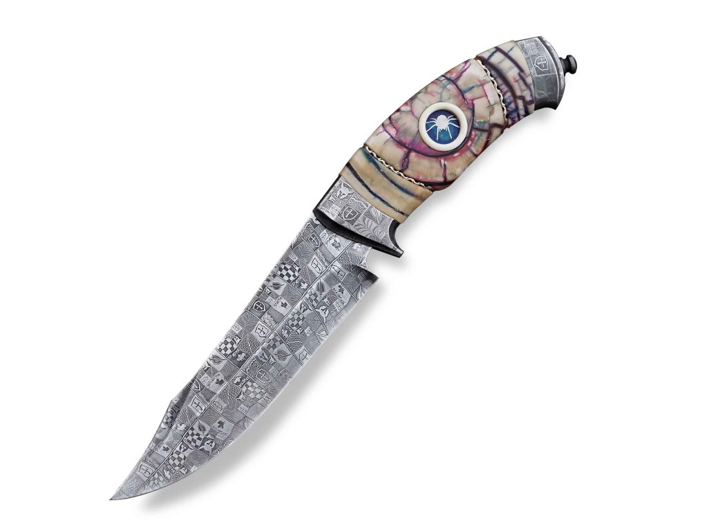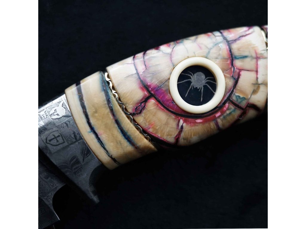 Exkluzivní nůž Dellinger Evil Spider Laminated Nr.04 s čepelí z laminované oceli a zdobenou rukojetí z pravé fosilie mamutího klu. Bolster a zakončení nože také z laminované damaškové oceli. Precizní ruční výroba, extrémní ostrost 60 HRC a nezaměnitelný luxusní design dělají z tohoto nože unikátní sběratelský kousek s příběhem. Nůž je uložen ve stylové luxusní kožené pochvě.