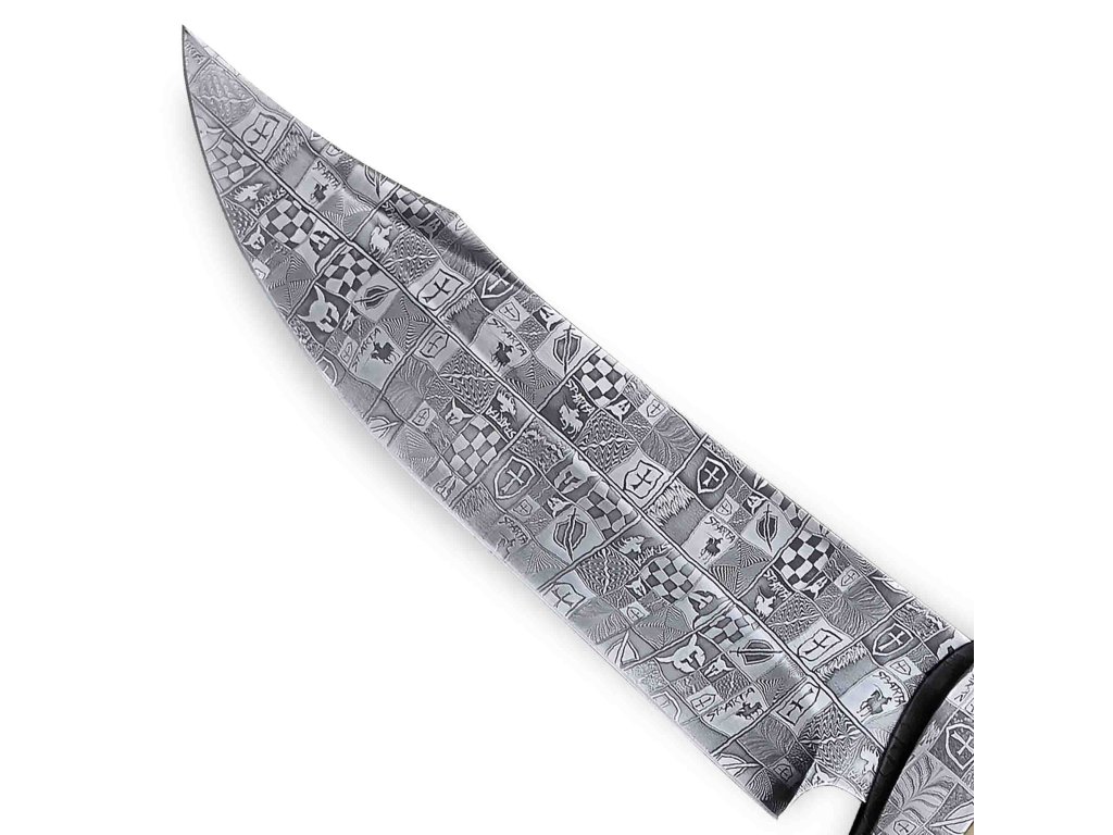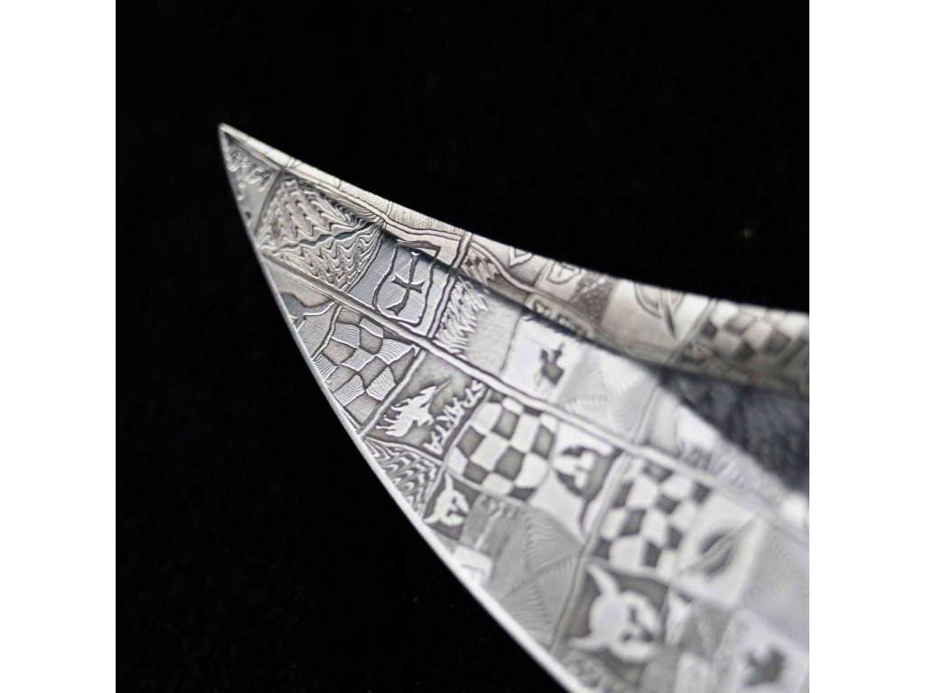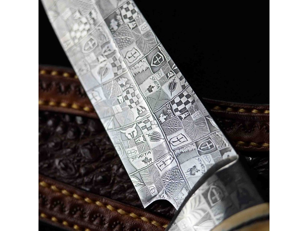 Jedinečný ručně vyrobený nůž s čepelí z laminované oceli. Každý nůž je ručně broušený a při použití této oceli o tvrdosti 60 HRC dosahuje mimořádné až extrémní ostrosti. Střenka (rukojeť nože) je broušená fosilie mamutího klu - zakončení + bolster též z laminované oceli. Mamutí fosilie klu a překrásná kresba laminované oceli tvoří perfektní pár - konečný výsledek je naprosto uchvacující.