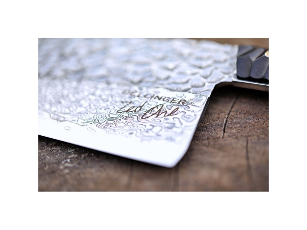 Tento exkluzivní nůž má ultra ostré řezné jádro z japonské oceli vg-10, které je velmi dobře chráněno proti korozi. Jádro z japonské oceli vg10 je vloženo mezi 98 vrstev 2 nerezových damaškových ocelí (damascus steel), které zajišťují mimořádnou odolnost a houževnatost. Damaškový vzor tohoto nože je jedinečný, neopakovatelný a stane se symbolem Vaší individuality! Na čepel nože propůjčil své jméno prezident Burgerfestu Praha Zdeněk Střížek, který se tak stal patronem tohoto jedinečného nože!