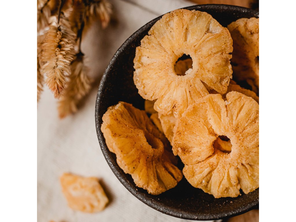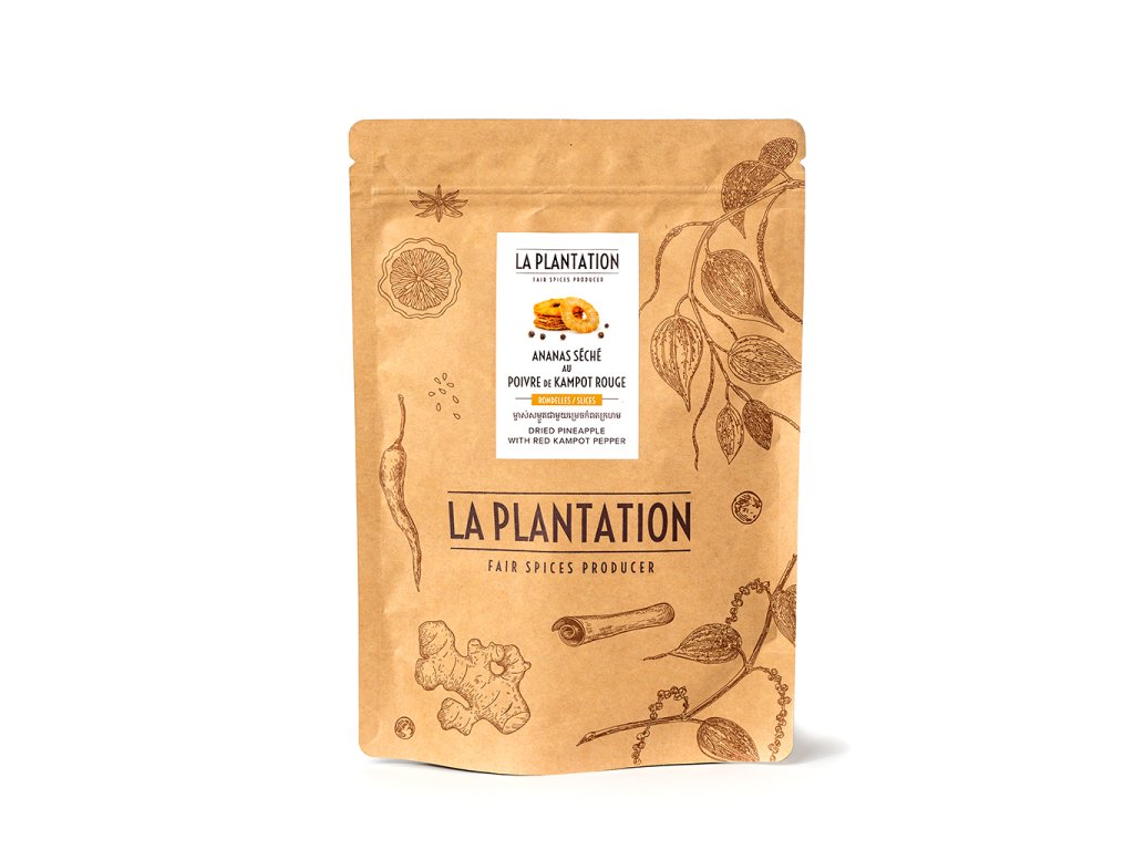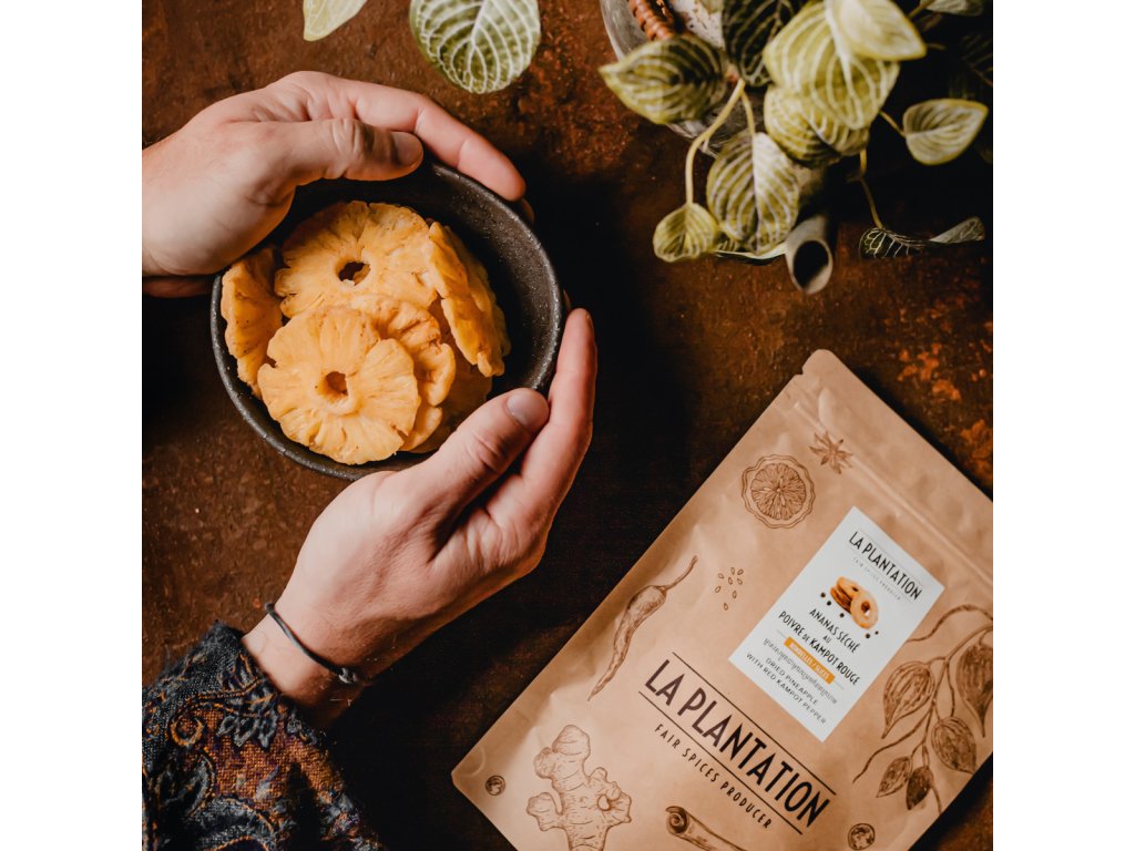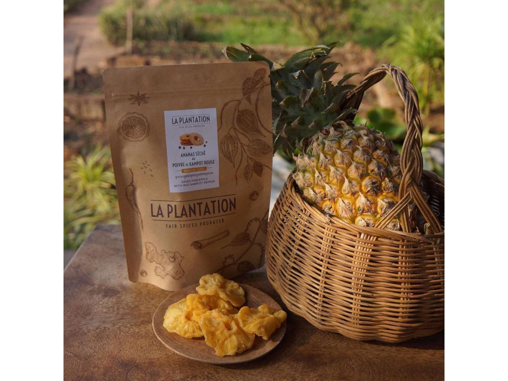 Ananas nám roste na farmě La Plantation doslova před dveřmi, v tomto případě je šetrně usušený tak, aby nebyl tvrdý a zachoval si kromě skvělé vůně a chuti i příjemnou strukturu. K tomu je navíc vyšperkován červeným Kampotským pepřem, který je rovněž lahůdkou sám o sobě.