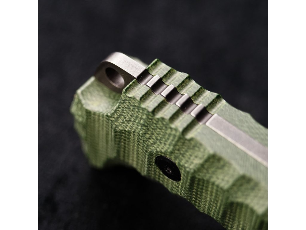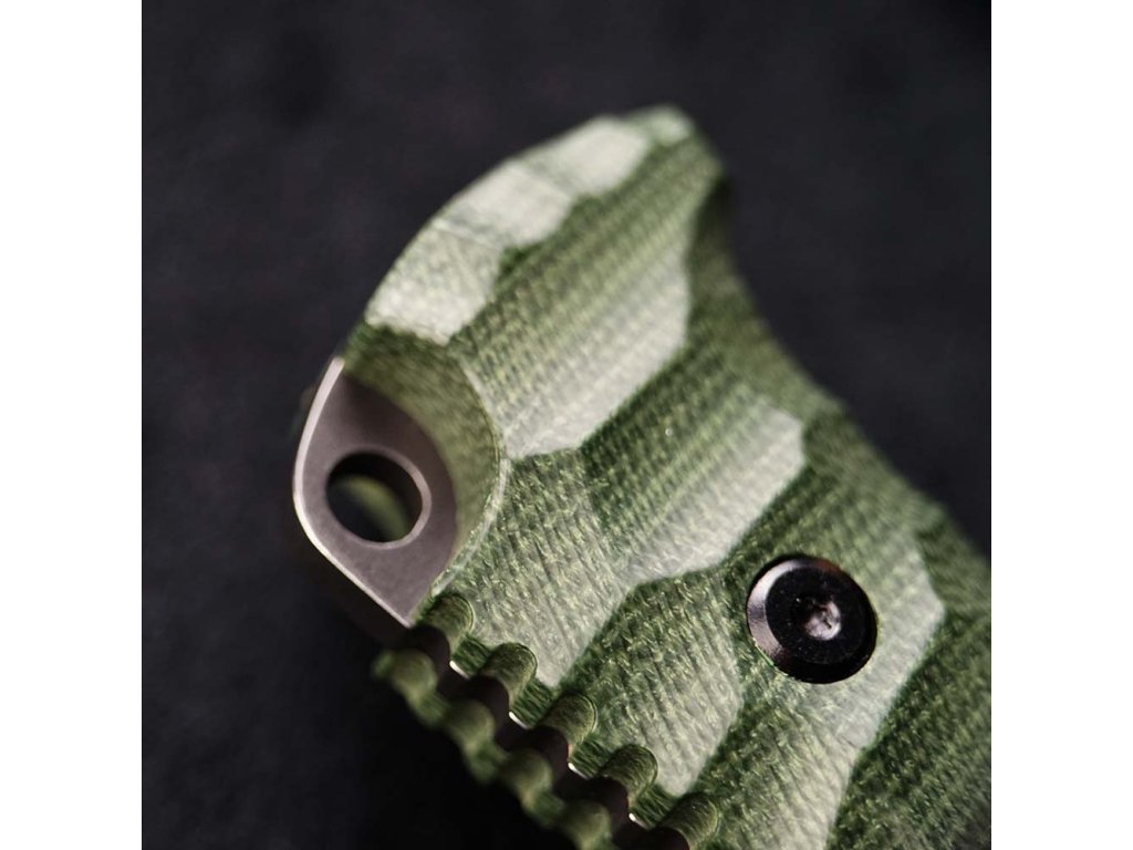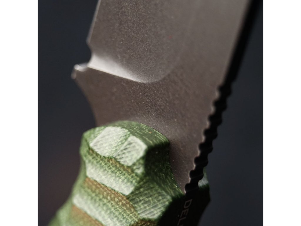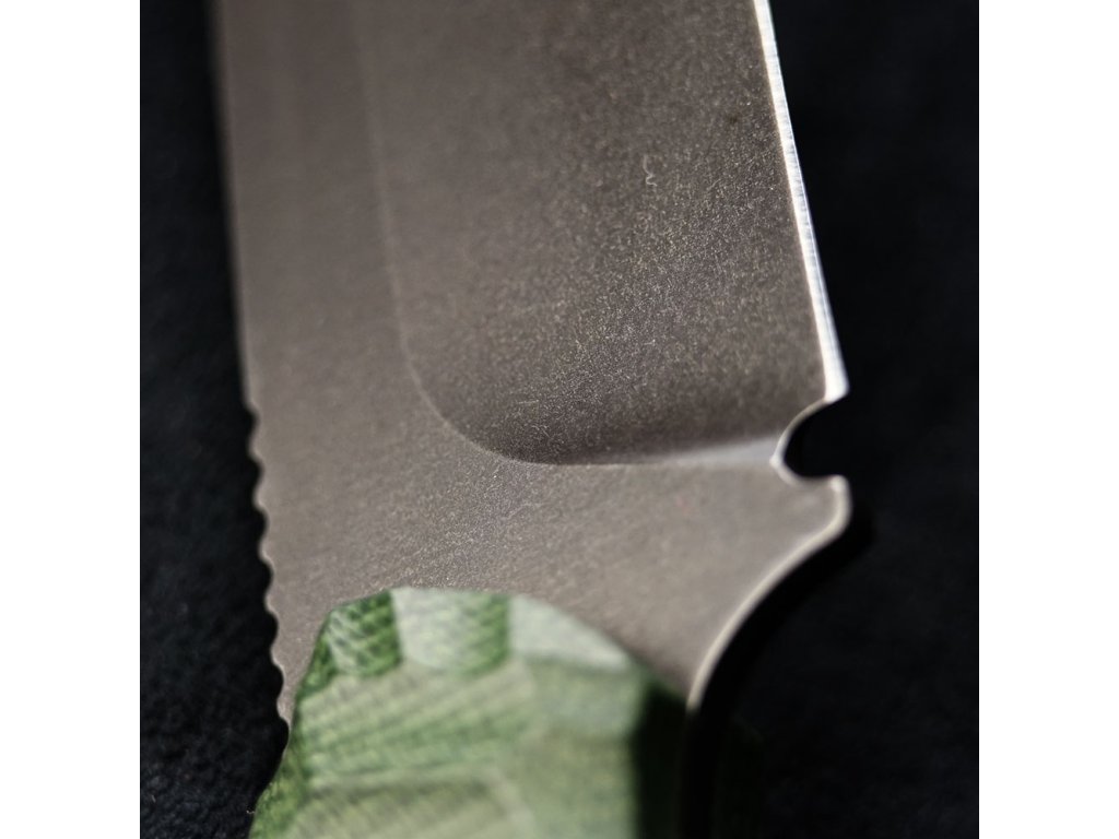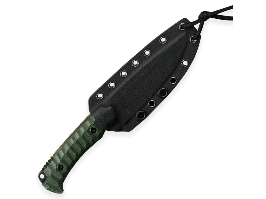 Taktický outdoorový nůž je dokonalou kombinací odolnosti, praktičnosti a precizního zpracování. Čepel je vyrobena z vysoce kvalitní nástrojové oceli DC53, která se vyznačuje vynikající tvrdostí, odolností vůči opotřebení a vysokou houževnatostí. Čepel je navíc opatřena povrchovou úpravou black coating, která zvyšuje odolnost proti korozi, minimalizuje odlesky a dodává noži atraktivní, taktický vzhled. Díky této úpravě a použité oceli je nůž schopný odolat extrémním podmínkám a dlouhodobému používání, což jej činí ideálním společníkem pro náročné outdoorové aktivity, bushcraft nebo survival. Ergonomická rukojeť z materiálu Micarta, která je zpracována do atraktivního zeleného vzoru, zajišťuje pevné a pohodlné uchopení i v nepříznivých podmínkách, jako je déšť nebo vlhkost. Texturovaný povrch rukojeti zabraňuje sklouznutí a poskytuje maximální kontrolu při práci. V zadní části je otvor pro paracord.