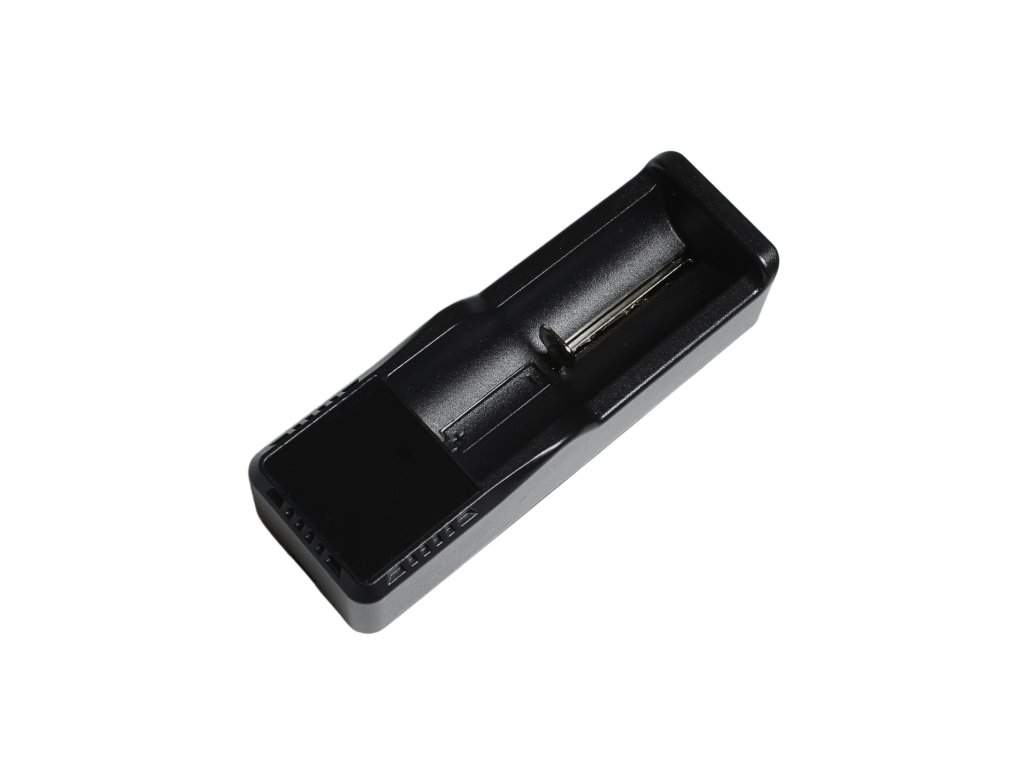 Lithium-iontová nabíječka s jedním nabíjecím slotem. Díky pohyblivému zadnímu kontaktu umožňuje nabíjení baterií v širokém rozsahu délek.