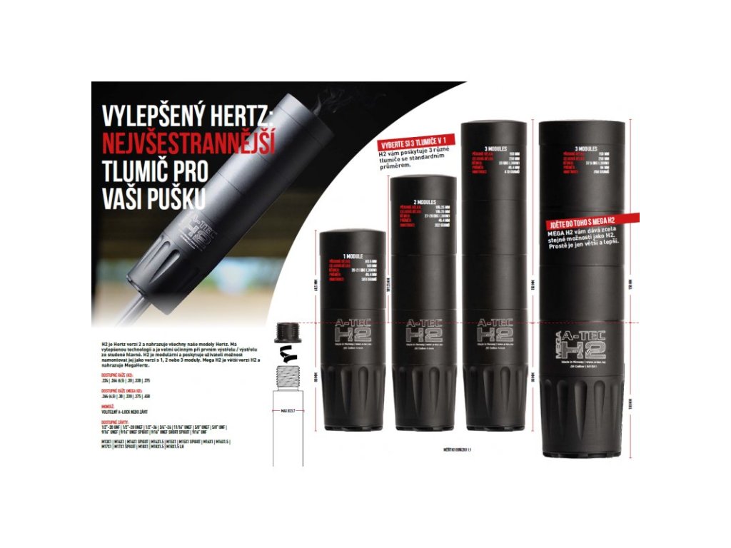A-TEC H2 a H2 Mega - kompletní popis technická data, seznam ráží a systémů upnutí v katalogu A-TEC v Českém jazyce ke stažení na našich stránkách. Bezkonkurenčně nejžádanější a nejprodávanější model. H2 je modulový tlumič, který je určen pro opakovací, samonabíjecí, lovecké a sportovní zbraně bez předních mířidel. Jde 8cm zpět přes hlaveň a přidává pouze 15cm se všemi 3 moduly k celkové délce zbraně! Jednotlivé moduly lze jednoduše odebírat a docílit tak ještě kompaktnějšího setu zbraně a tlumiče, což může být výhodné např. při naháňkách, dosledech, čištění a údržbě. Model H2 Mega je pouze větší a je určen pro lepší účinek např. u ráží magnum apod. https://www.youtube.com/watch?v=joO_XDBxwOA