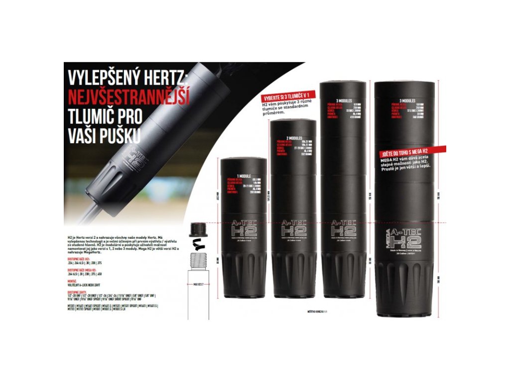 A-TEC H2 a H2 Mega - kompletní popis technická data, seznam ráží a systémů upnutí v katalogu A-TEC v Českém jazyce ke stažení na našich stránkách. Bezkonkurenčně nejžádanější a nejprodávanější model. H2 je modulový tlumič, který je určen pro opakovací, samonabíjecí, lovecké a sportovní zbraně bez předních mířidel. Jde 8cm zpět přes hlaveň a přidává pouze 15cm se všemi 3 moduly k celkové délce zbraně! Jednotlivé moduly lze jednoduše odebírat a docílit tak ještě kompaktnějšího setu zbraně a tlumiče, což může být výhodné např. při naháňkách, dosledech, čištění a údržbě. Model H2 Mega je pouze větší a je určen pro lepší účinek např. u ráží magnum apod. https://www.youtube.com/watch?v=joO_XDBxwOA