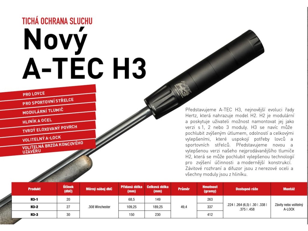 A-TEC H3 nahrazuje doposud nejžádanější a nejprodávanější model H2. Přináší vyšší účinnost (zejména u prvního výstřelu), odolnější konstrukci s ohledem na méně pečlivou údržbu, modernější design a nižší hmotnost. Model H3 je modulový tlumič určen pro opakovací i samonabíjecí lovecké a sportovní zbraně bez předních mířidel. Reflexní tělo jde cca 8 ,cm zpět přes hlaveň a s třemi moduly přidává ~15 ,cm k celkové délce zbraně.