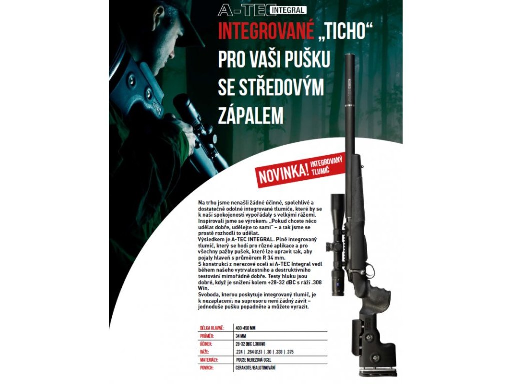Nový tlumič Integral od firmy A-TEC je špičkovým produktem, který nabízí zcela odlišné parametry než jiné "integrované" tlumiče na trhu pro ráže se středový zápalem. Celonerezová konstrukce, povrchová úprava Cerakote. U zbraní, na které se má tlumič instalovat dodatečně, je nutná úprava hlavně puškařem. Určeno pro pažby které lze upravit na průměr hlavně 34mm.