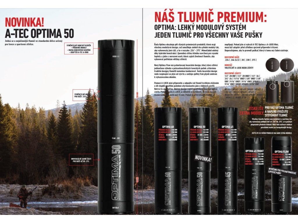 Řada A-TEC Optima zahrnuje modely Optima 60, Optima 50 a Optima 45 (určené pro opakovací i samonabíjecí zbraně bez předních mířidel), dále Optima Front (pro zbraně s pevnými mířidly) a Optima Flow (se sníženým protitlakem pro samonabíjecí lovecké a sportovní zbraně). Všechny modely využívají výměnný přední modul, takže můžete mít jeden tlumič a jen měnit modul podle ráže.