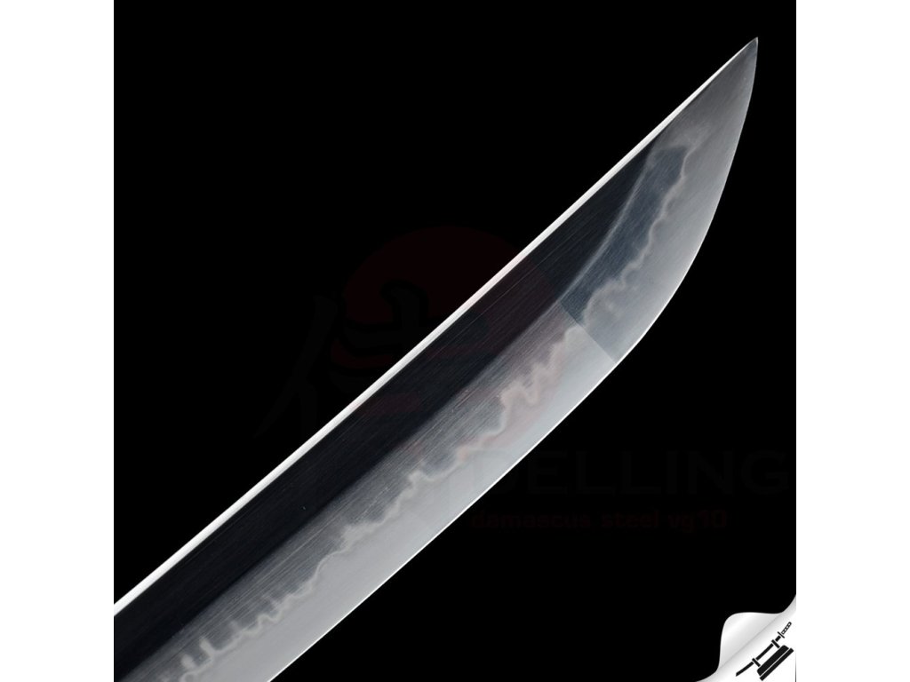 Ručně kovaná čepel z oceli T-10 té nejvyšší kvality. Ocel byla laminována v monokompositní konfiguraci Maru - diferenciálně tvrzená. Uhlíková ocel T-10 (obsah 1,1% uhlíku a 0,4% manganu) je velmi pevná a skvěle drží ostrost. Čepel bez žlábku bo-hi byla ve finální fázi ručně leštěna kamenem hazuya - tím je dosaženo téměř žiletkového ostří (razor sharp) a zrcadlového lesku.
