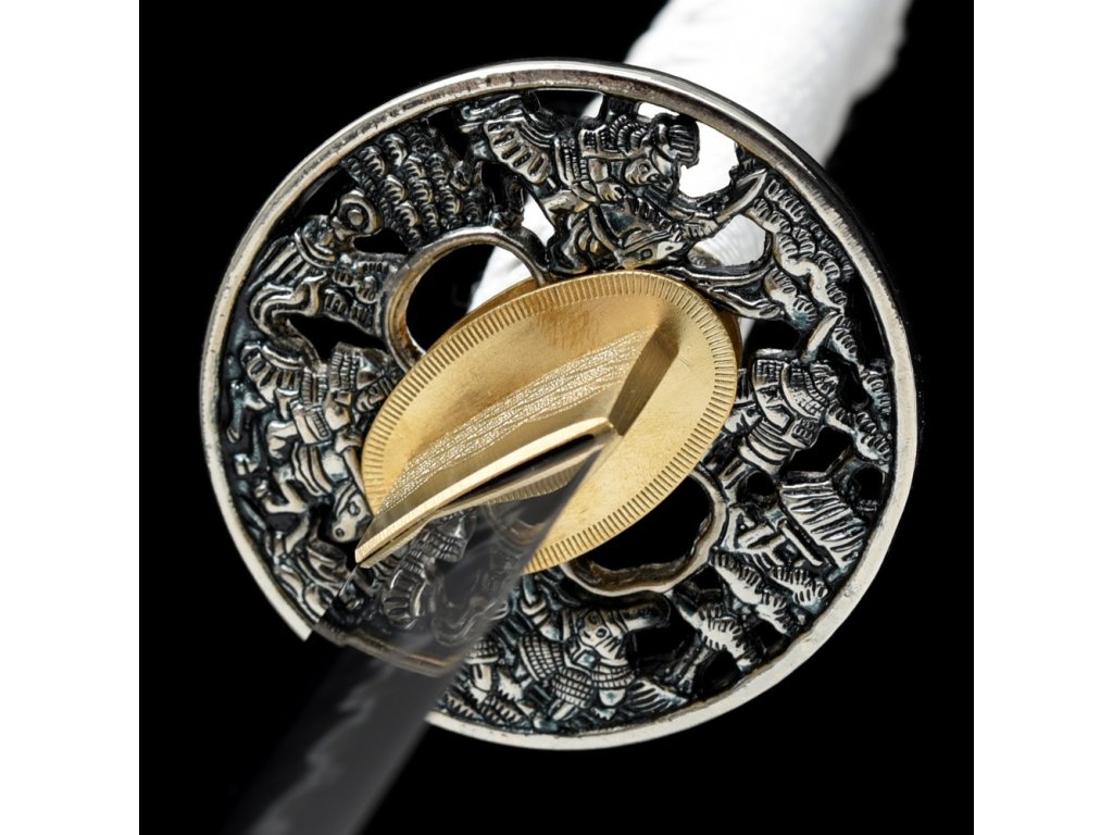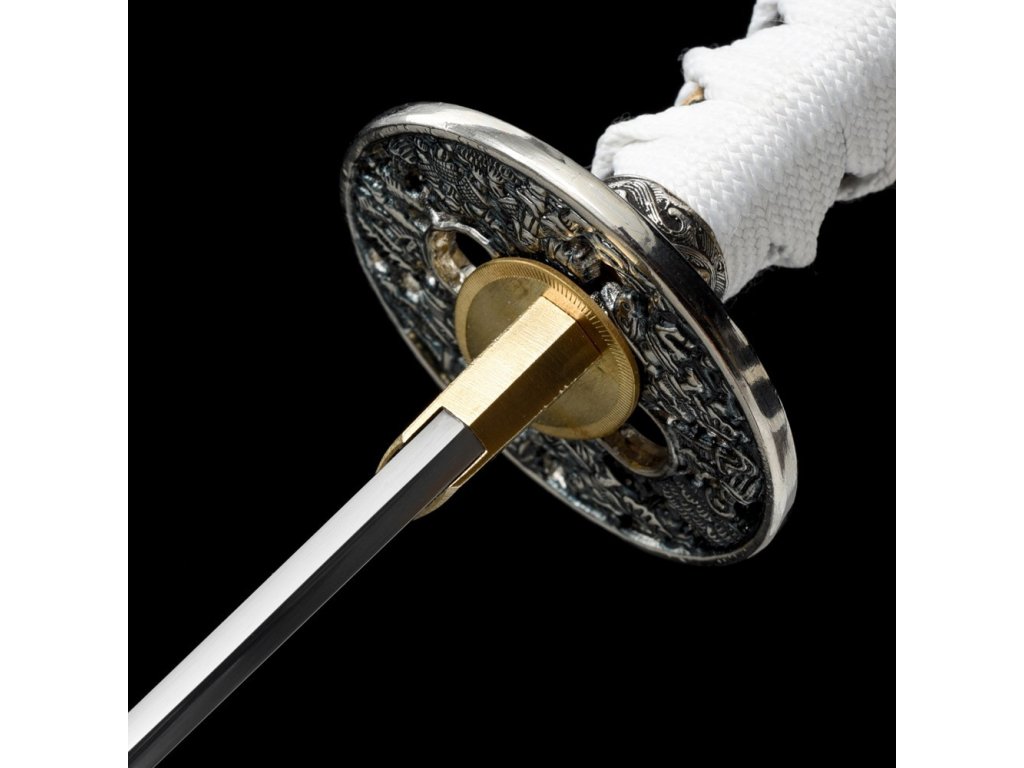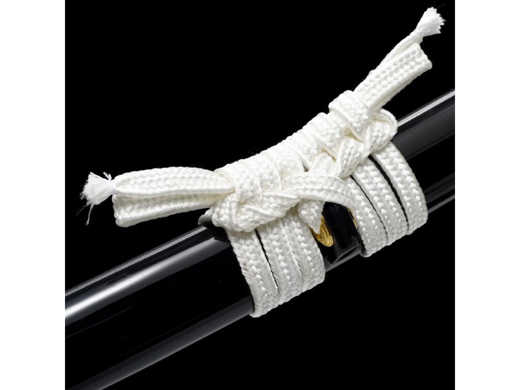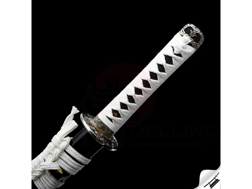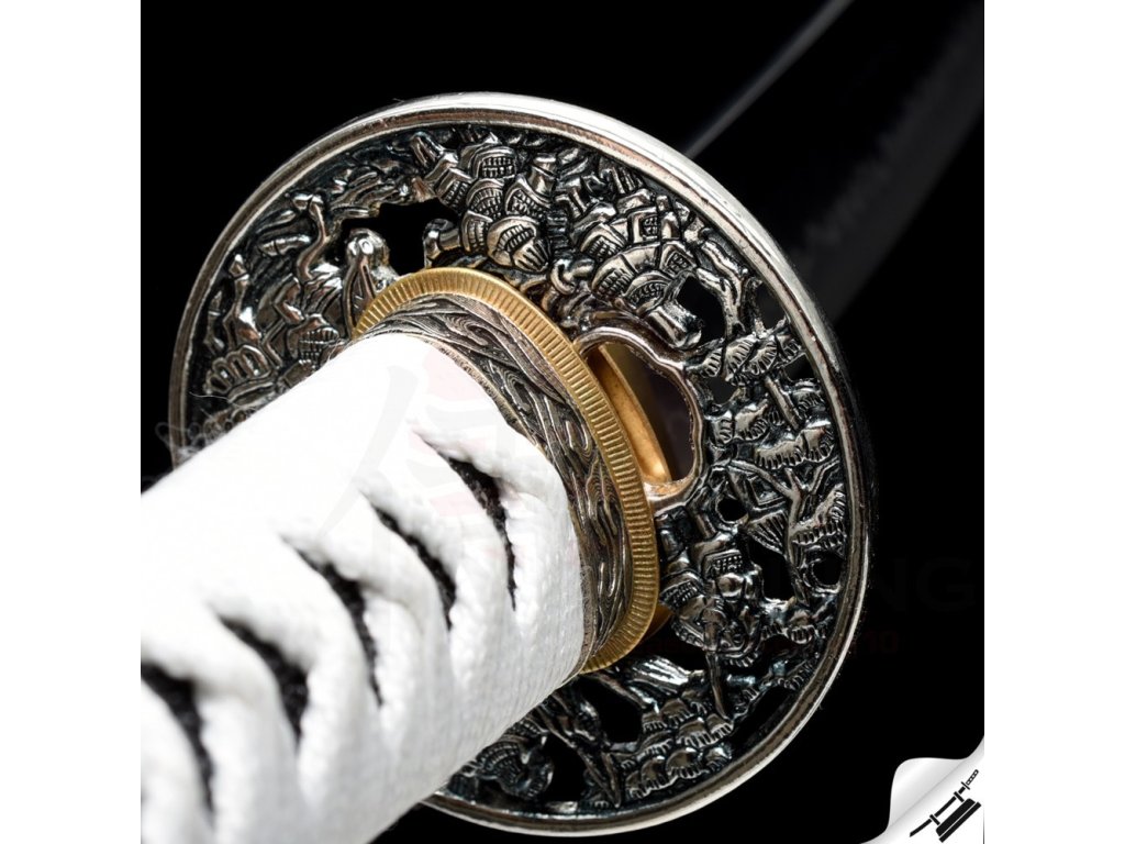 ✅ Tsuka: (rukojeť) dřevěné jádro, potažena pravou rejnočí kůží (Samegawa), s hedvábnou bílou omotávkou ITO. Čepel zajištěna 1 kolíkem "mekugi"
