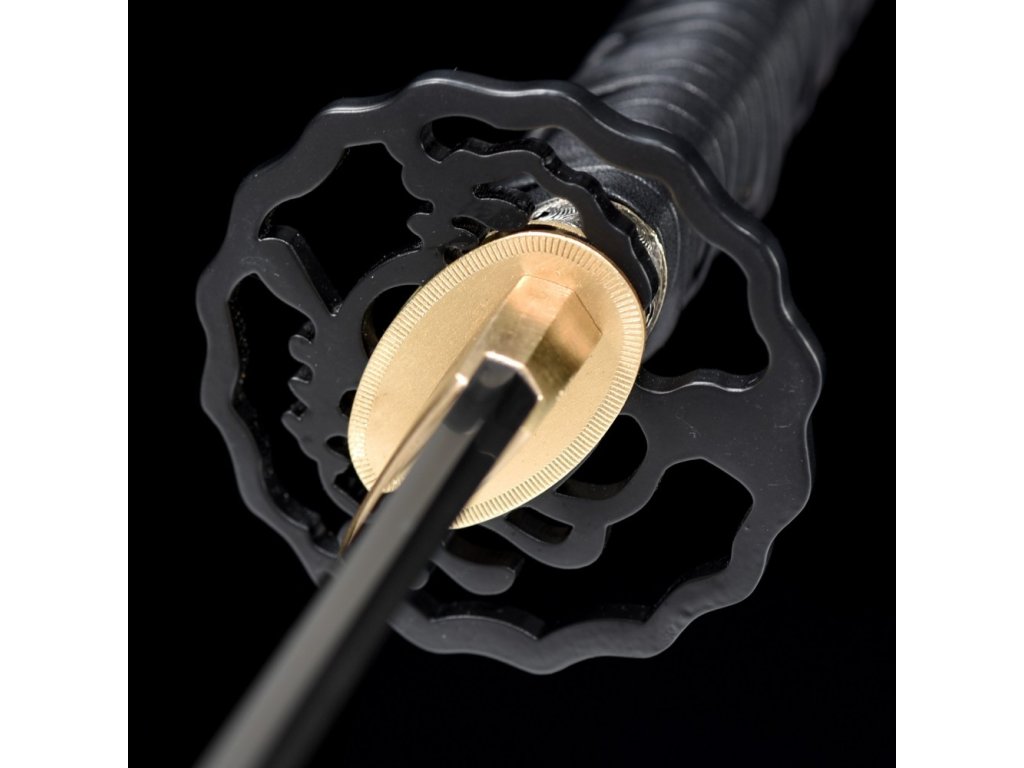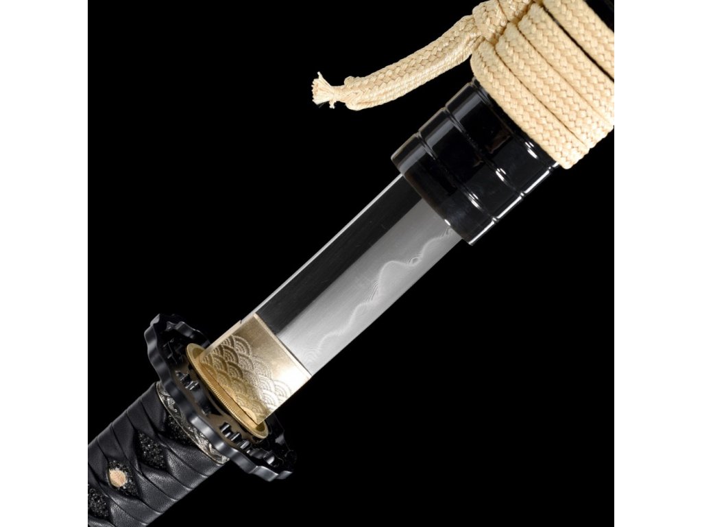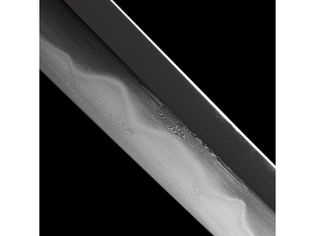 Čepel z damascénské oceli AISI 1095 v kombinaci s ocelí AISI 1060. Jedná se o velmi ostrý meč vhodný k sekovým zkouškám. Výrazný reálný Choji hamon je tvořen dle dávných tradičních metod, které vychází z mnohaletých zkušeností kovářského mistra, který výrobou této nádherné zbraně strávil několik dnů. Vše na tomto meči je individuálně zhotoveno, včetně saye a habaki, jsou použity nejkvalitnější komponenty, včetně špičkového laku na sayu a skutečné rejnočí kůže nejvyšší kvality. Jedná se o špičkovou repliku samurajského meče, která je vhodná k sekovým zkouškám a lze ji rozložit na jednotlivé části. Tato čepel byla vyzkoušena a testována tak, aby odstranila vše co jí stojí v cestě ! Sori (zakřivení čepele) je speciálně navrženo tak, aby bylo dosaženo co možná nejjemnějších a nejčistších řezů. To vše v kombinaci s výběrem tradičního Koshirae zaručuje, že získáte to nejlepší z hlediska vzhledu i funkčnosti. Uhlíková damašková ocel má působivou tvrdost. Perfektní kombinace této tvrdosti je podtrženo zakřivením čepele Sori, které umožňuje snadné přeseknutí tatami, slaměné rohože, nebo bambusu pro tameshigiri. Full tang konstrukce této katany výrazně zvyšuje sílu meče. Čepel je typu shinogi-zukuri - tento typ čepele se vyrábí od 10.století našeho letopočtu. Hrot meče ko kissaki se skutečným Diamond-Shaped Yokote, které je velmi dobře definováno tím, že hamon prochází po celé délce přes Boshi. Yokote je velmi důležité pro strukturální integritu špičky meče. Pomáhá absorbovat otřes, rozptýlí sílu a přispívá k stabilitě a síle meče při tzv. sekořezu. Tato katana (samurajský meč) je vhodná na použití v praxi, firma Dellinger se však zříká jakékoliv odpovědnosti za zranění a poškození vzniklá při použití. Schraňujte mimo dosah dětí ! Jakákoliv manipulace se samurajským mečem je na vaší vlastní odpovědnost. Nezapomeňte, že máte ve svých rukou smrtící zbraň !