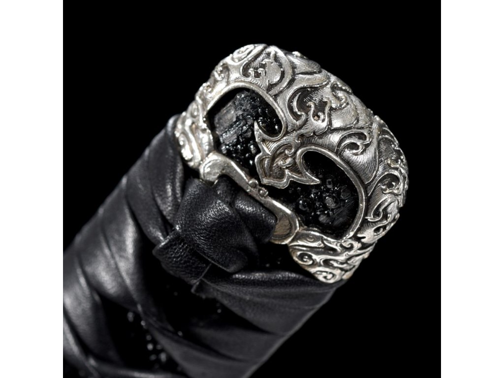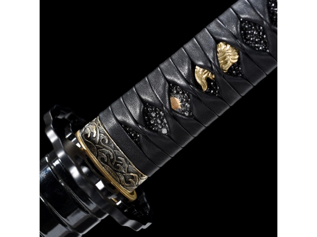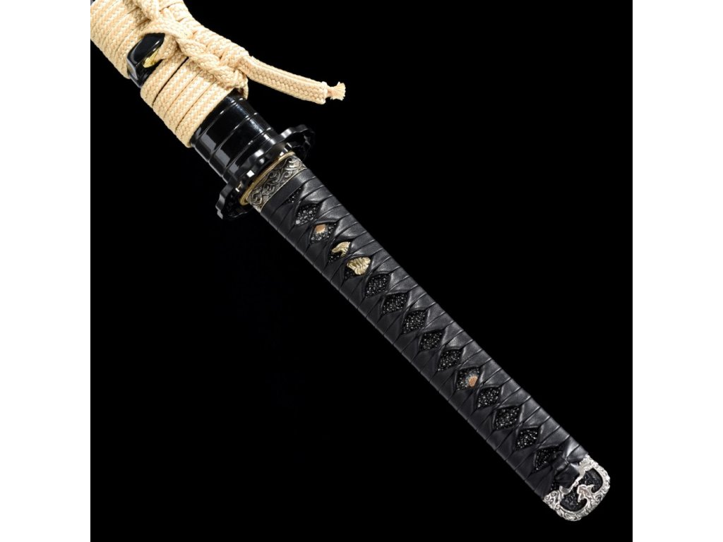 • Tsuka (rukojeť) - dřevěné jádro, potažena pravou rejnočí kůží (Samegawa), s černou koženou omotávkou ITO. Čepel zajištěna 2 bambusovými kolíky "mekugi". Menuki (ornament) z každé strany Tsuky.