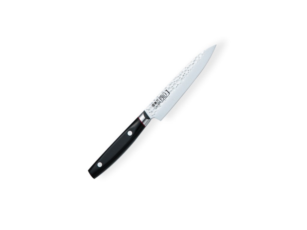 Japonský univerzální nůž Utility 120 mm ze série Kanetsugu PRO-J Hammer. Praktický nůž pro krájení, plátkování, čištění masa, ovoce, zeleniny a zpracování bylinek. Kuchařský nůž s jádrem z oceli ZA-18 a rukojetí dřeva Black Pakkawood.