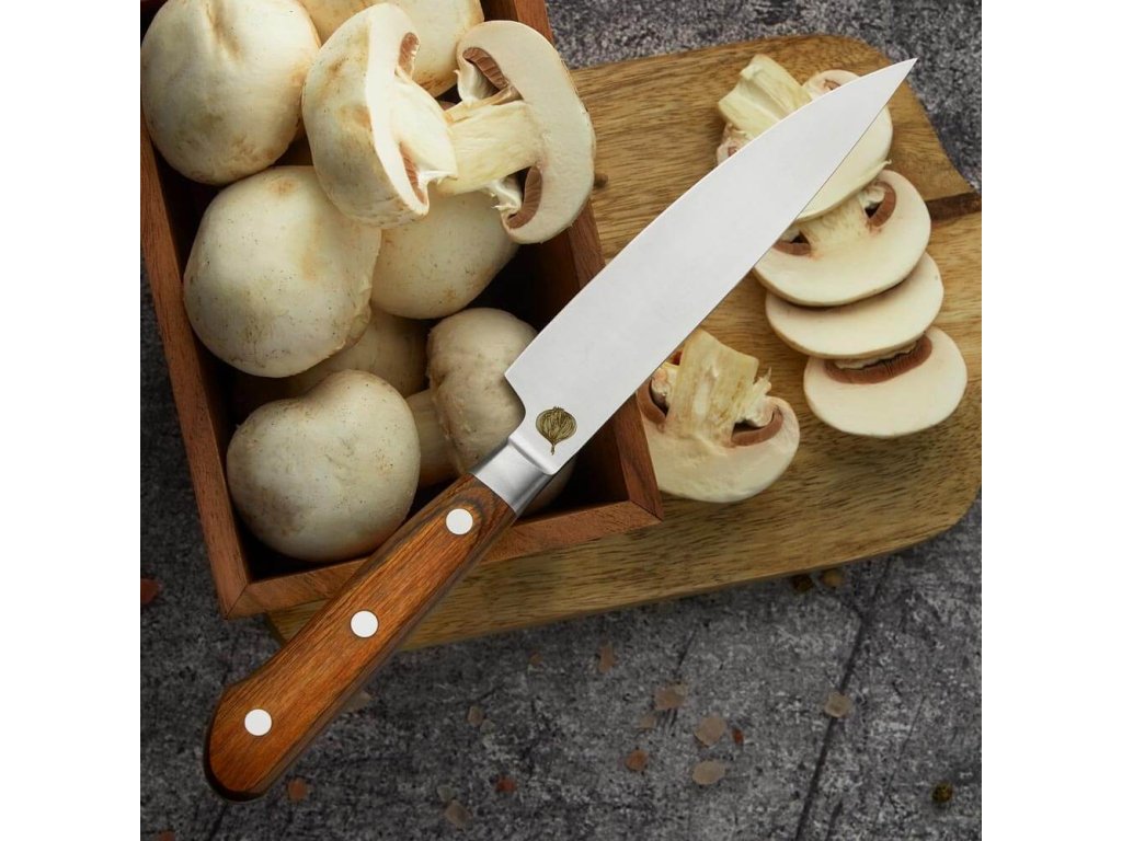 Čtvrtý nůž z nové série Dellinger Essence. V Japonsku by se pomocnému univerzálnímu noži říká "petty utility knife" (ペティナイフ, peti-naifu). Petty Utility knife je univerzální pomocný nůž, který doplňuje větší nože a je ideální pro precizní úkoly, jako je krájení menších surovin, loupání, filetování nebo dekorace. Tento nůž, který ocení "nejen" každá žena se skvěle se hodí pro práci s drobnějšími surovinami v kuchyni, jako je krájení zeleniny nebo cibule. Nůž s čepelí dlouhou 130 mm je vyroben z německé oceli 1.4116, známé svou vysokou odolností proti korozi a schopností udržet ostří po dlouhou dobu. Univerzální nůž s rukojetí z pakkawoodu, která je nejen stylová, ale i odolná vůči vlhkosti a teplotním změnám.