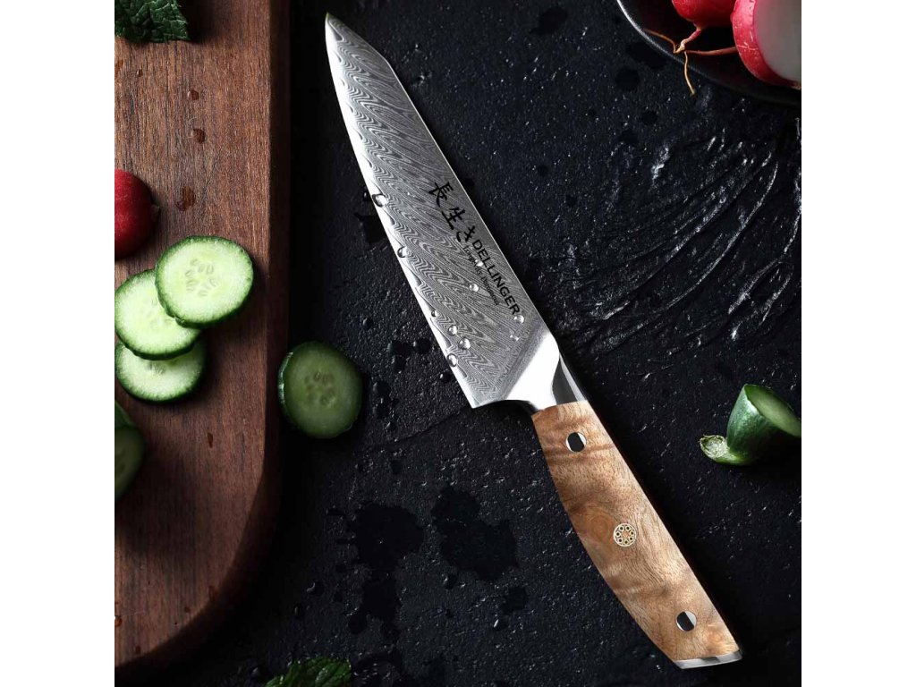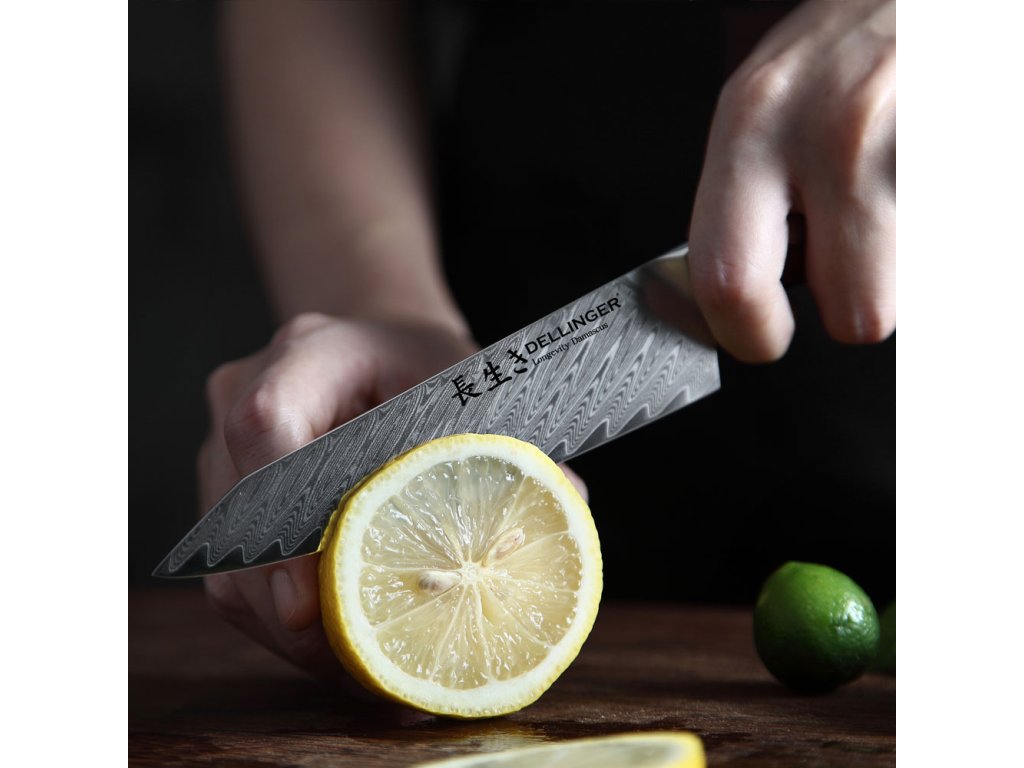 Nová série nožů Dellinger Longevity Damascus Edition přináší spojení tradičního japonského designu a moderních materiálů. Tento univerzální nůž, známý jako "Petty Utility Knife" (ペティナイフ, peti-naifu), je ideální volbou pro precizní kuchyňské úkoly. Díky délce čepele 130 mm je perfektní pro krájení menších surovin, filetování, loupání nebo zdobení, a skvěle doplňuje větší nože, jako jsou gyuto nebo santoku.