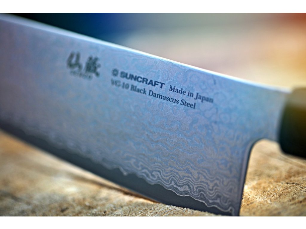 Nože ze série Suncraft VG-10 Black Damascus mají ultra ostré řezné jádro z japonské oceli VG-10, které je velmi dobře chráněno proti korozi. Japonská ocel VG-10 má dlouhotrvající ostrost při tvrdosti R62 +/-1 Rockwella. Jádro z japonské oceli VG-10 je vloženo mezi 66 vrstev 2 nerezových damascénských ocelí, které zajišťují mimořádnou odolnost a houževnatost. Dokonale vyvážená, přesně zúžená čepel japonského tvaru s třpytivým damascénským vzorem minimalizuje tření při řezu a zabraňuje přilepení krájeného materiálu k čepeli. Damascénský vzor je jedinečný a neopakovatelný.
