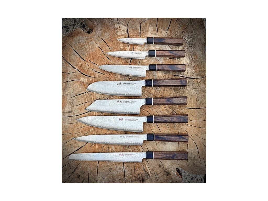 Velmi ostrý japonský nůž na okrajování ovoce a zeleniny ze série Suncraft VG-10 Black Damascus z damascénské oceli s odolnou a krátkou čepelí je užitečnou alternativou velkého šéfkuchařského nože v okamžiku, kdy potřebujete přesné řezy nebo například krájení zelených fazolí a jiné menší zeleniny a ovoce. Je vhodný také pro špikování a krájení masa. Zaoblené ostří umožňuje mírné kývání při řezu. Jeho ostrost je ideální pro přípravu sendvičů všeho druhu. Japonské umění a nové technologie činí tento nůž jedinečným a nenapodobitelným.