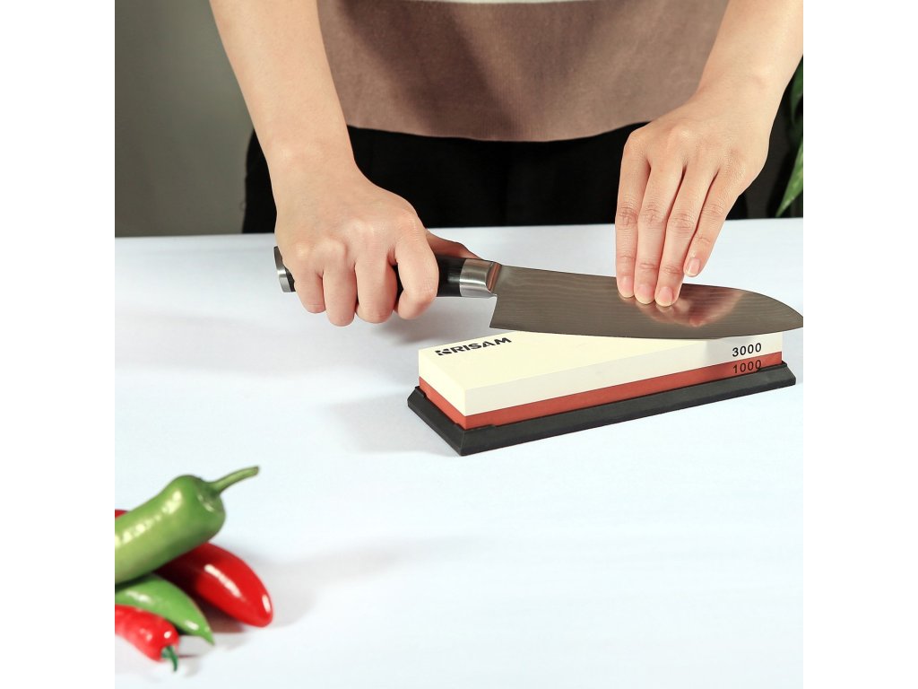 Velký kombinovaný vodní brusný kámen Risam s velmi rychlým brusným a leštícím efektem. Kámen je vyrobený ze syntetického Korundu (oxid hlinitý). Brusný kámen je dodáván s gumovou protiskluzovou podložkou. Hrubost JIS #1000/#3000. Rozměr 200x80x30 mm.