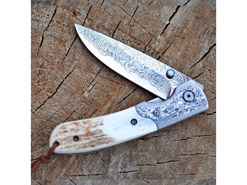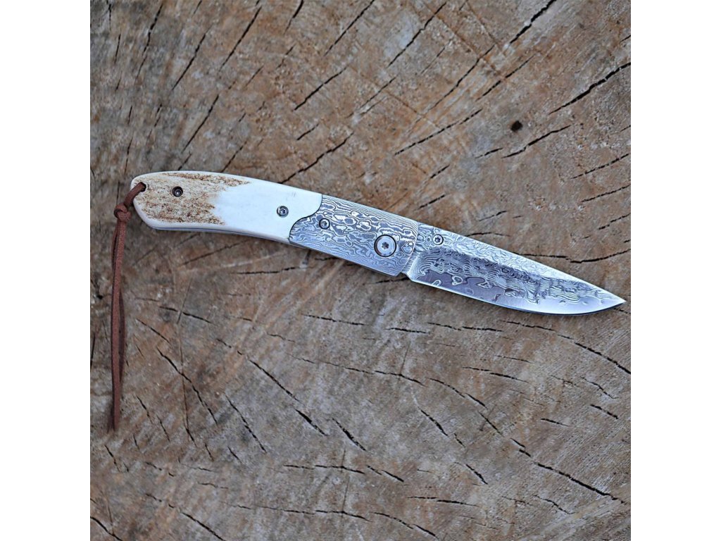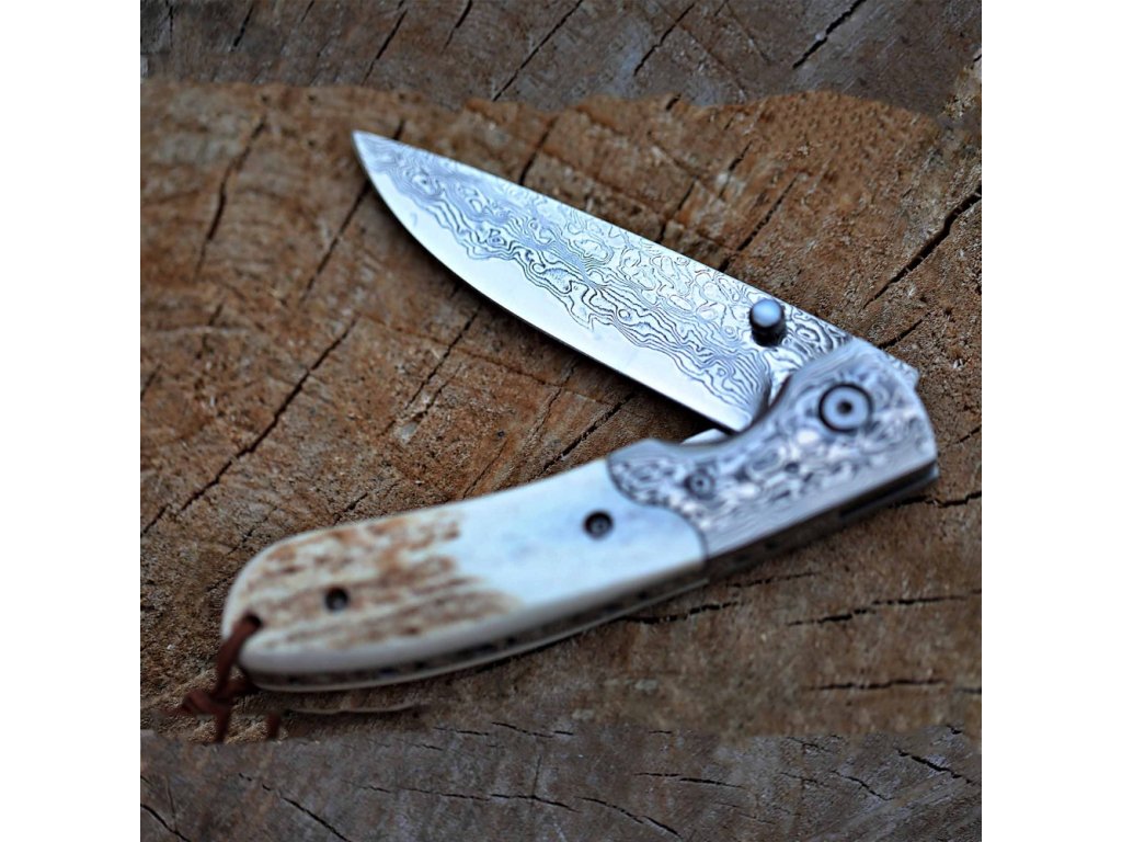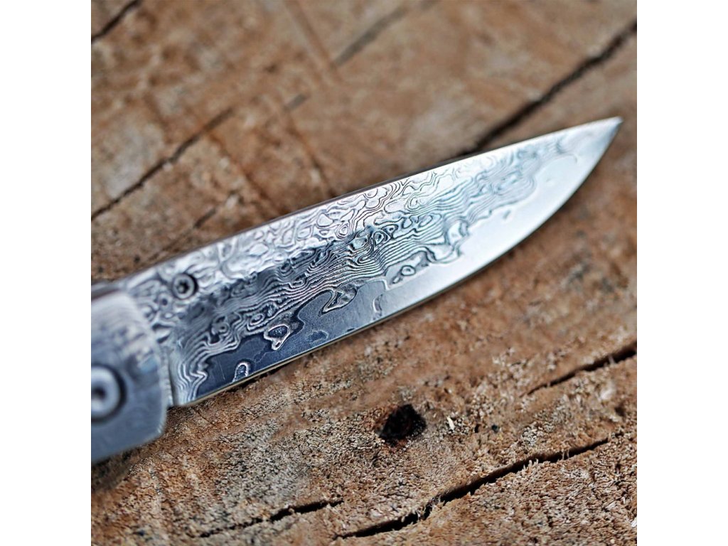 Zavírací nůž Dellinger Weidmann s čepelí s řezným jádrem z oceli VG-10, vloženým mezi 66 vrstev nerezového damašku. Tvrdost 60 HRC zaručuje dlouhou životnost ostří i snadné broušení. Rukojeť z paroží s damaškovým bolsterem dodává noži luxusní vzhled. Čepel je uložena v kuličkových ložiscích a jištěna pojistkou liner lock. Dodává se s koženým pouzdrem.