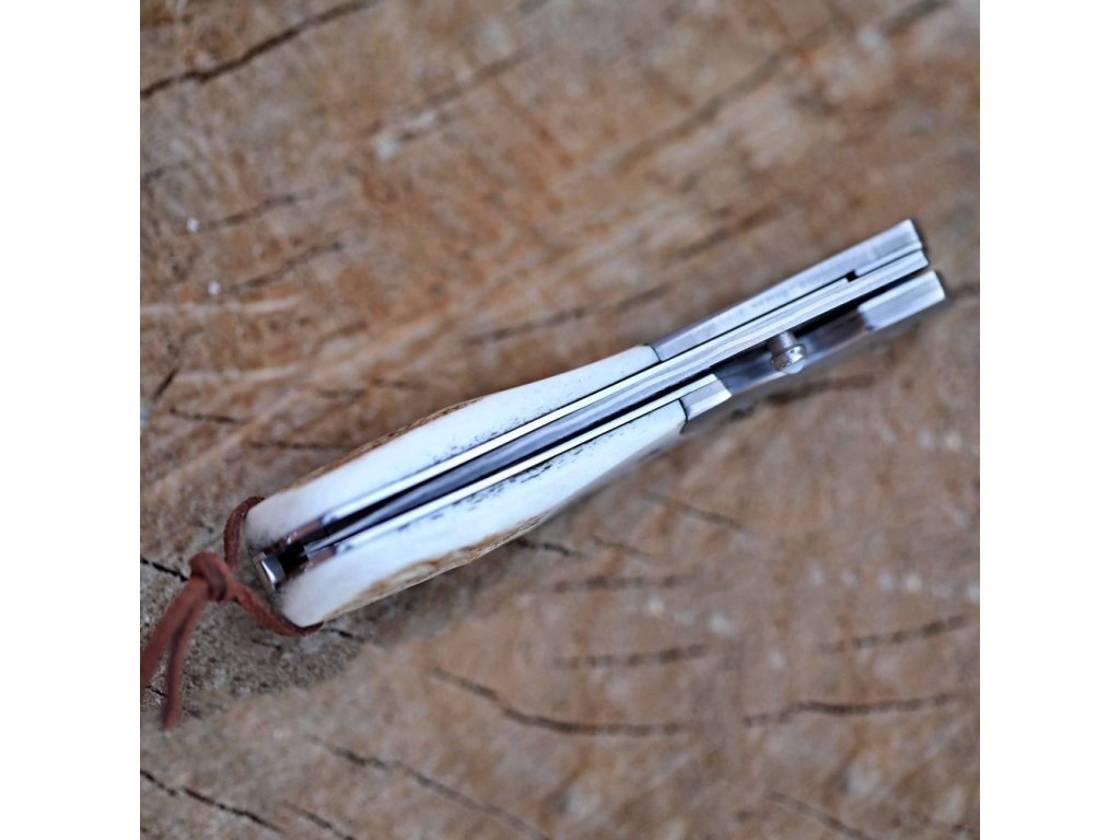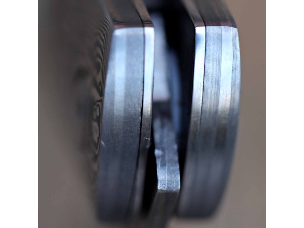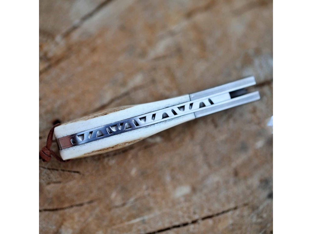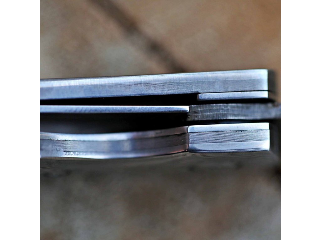 Zavírací nůž Dellinger Weidmann s čepelí s řezným jádrem z oceli VG-10, vloženým mezi 66 vrstev nerezového damašku. Tvrdost 60 HRC zaručuje dlouhou životnost ostří i snadné broušení. Rukojeť z paroží s damaškovým bolsterem dodává noži luxusní vzhled. Čepel je uložena v kuličkových ložiscích a jištěna pojistkou liner lock. Dodává se s koženým pouzdrem.