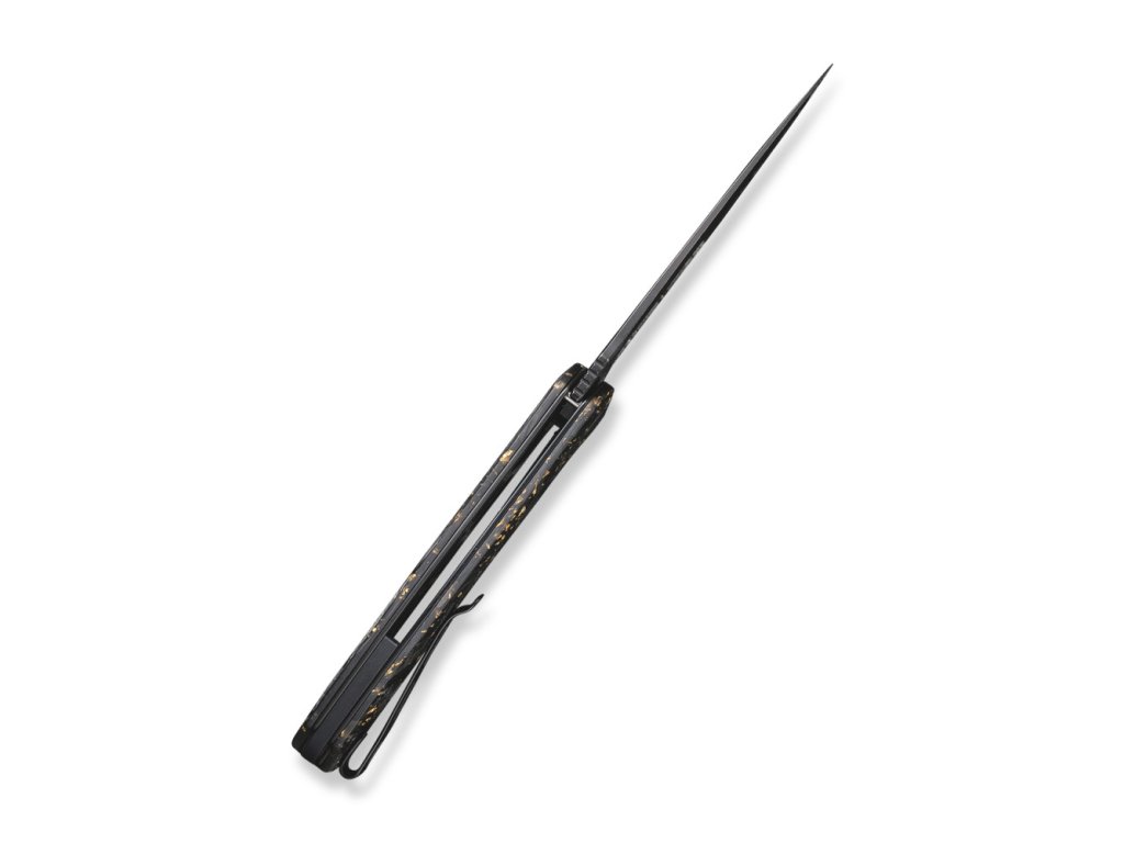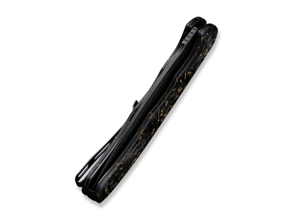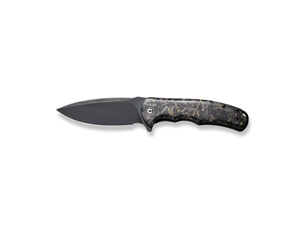 Stylový taktický zavírací nůž CIVIVI Praxis Gold vyniká čepelí z oceli 9Cr18MoV s povrchovou úpravou black stonewashed a luxusní rukojetí z uhlíkových vláken se zlatými plátky v pryskyřici. Praktický EDC nůž s nylonovým pouzdrem.
