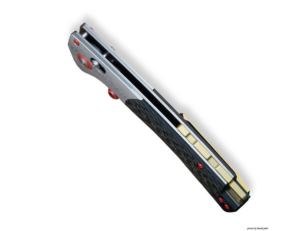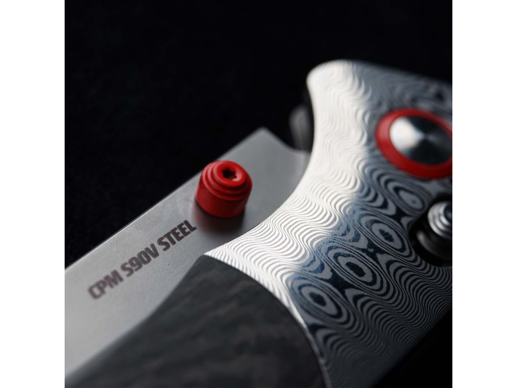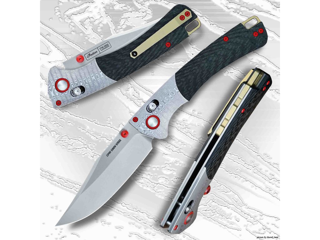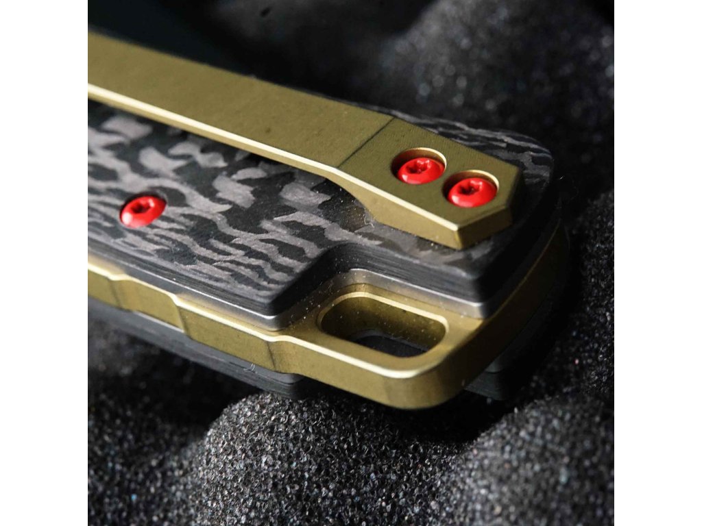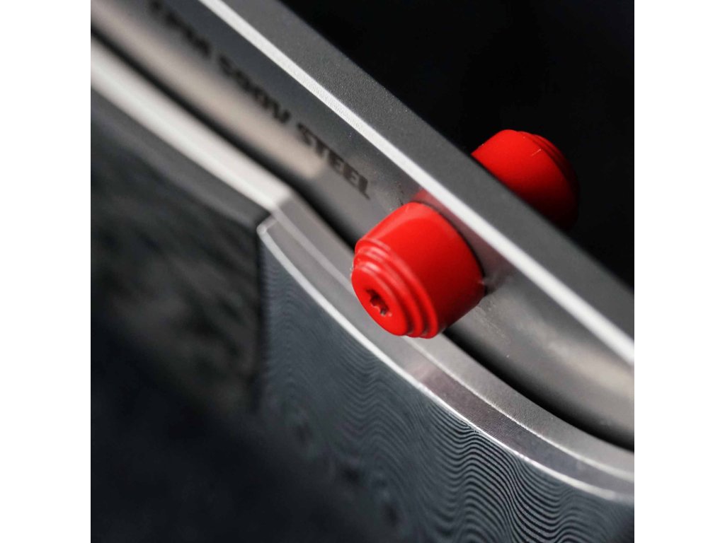 Dellinger Indian Carbon CPM S90V je limitovaná edice EDC nože, který je inspirovaný motocyklem Indian FTR R Carbon. Vyroben je z prvotřídních materiálů, je lehký, štíhlý a zároveň ergonomický. Čepel délky 10 cm je vyrobena z vynikající práškové oceli CPM S90V o tvrdosti 62 HRC s povrchovou úpravou stonewashed, plochý výbrus a tvar trailing point. Rukojeť z uhlíkových vláken s červenými šroubky, zlatým klipem a záštitou z nerezové damaškové oceli. Nůž disponuje oboustranným klipem na zavěšení s kuličkou na konci, tak aby nůž nepotrhal vaši kapsu při zasouvání. Nůž je tedy vhodný pro praváky i leváky. Pojistka typu Bar Axis Lock proti samovolnému zavření + velký otvor na šňůru - lanyard hole jen podtrhují kvalitu a užitnou hodnotu zavíracího nože. Jednoruční otvírání pomocí kolíčku na čepeli. Nůž je dodávaný bez pouzdra, ale pouzdro lze objednat pod tímto odkazem.