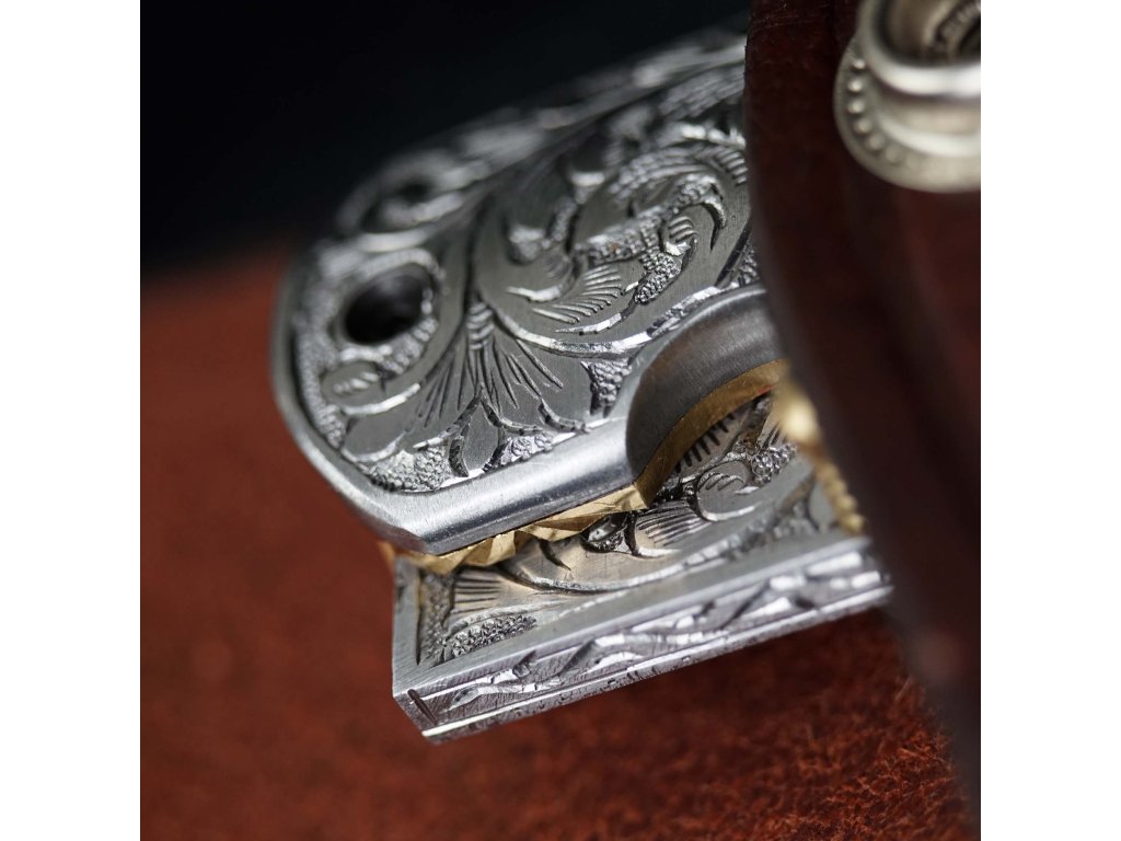 Zavírací nůž Dellinger Kizama D2 Wenge představuje exkluzivní, bohatě zdobenou variantu oblíbeného modelu Sentinell. Tento nůž zaujme na první pohled ručně rytou čepelí z nástrojové oceli D2 a stejně zdobeným bolsterem (záštitou). Čepel je vybavena oboustranným kolíčkem pro pohodlné otevírání jednou rukou, což z něj činí ideální nástroj pro každodenní nošení (EDC) i outdoorové aktivity.