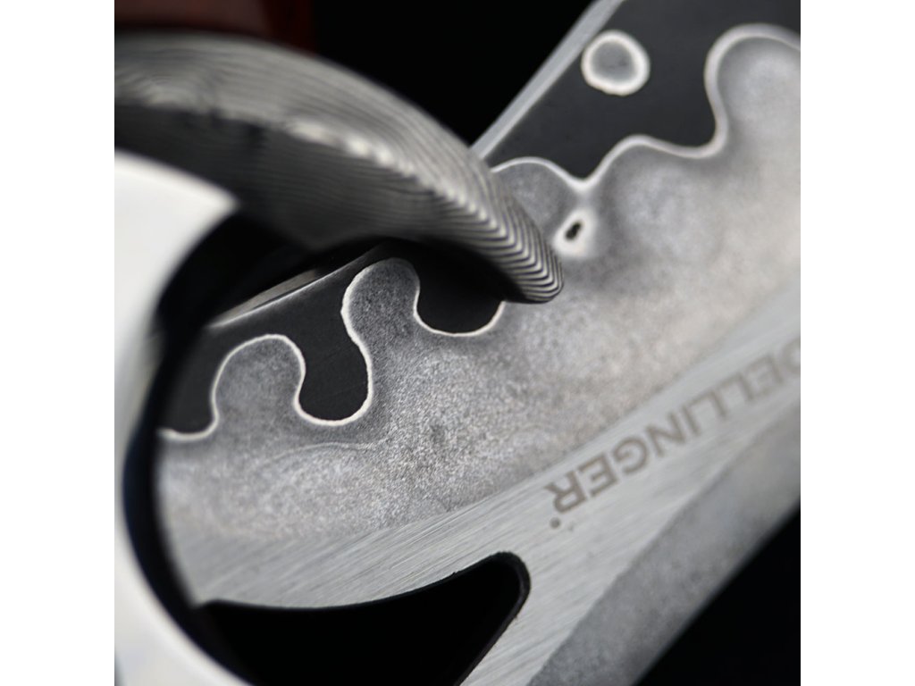 Nůž Dellinger Spett SKD11 je ideální volbou pro uživatele, kteří ocení spojení elegance, funkčnosti a precizního zpracování. Čepel nože je vyrobena z vysoce kvalitní oceli SKD11, která se vyznačuje mimořádnou tvrdostí, odolností vůči opotřebení a schopností dlouho udržet ostrost. Její jedinečný tvar s vlnkovitým vzorem nejen působí atraktivně, ale také zajišťuje výborné řezné vlastnosti. Nůž je vhodný jak pro přesné, tak i hrubší řezy, což z něj dělá všestranný nástroj. Zavírací mechanismus umožňuje snadné a bezpečné otevírání jednou rukou, přičemž pojistka pevně zajišťuje čepel při práci.
