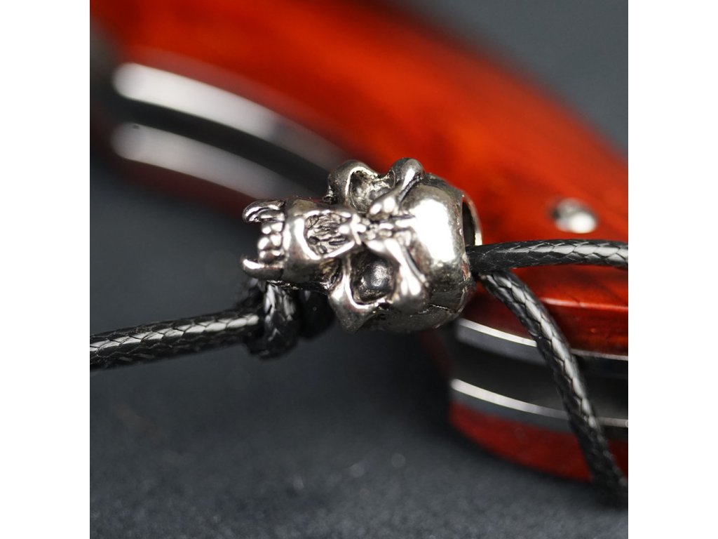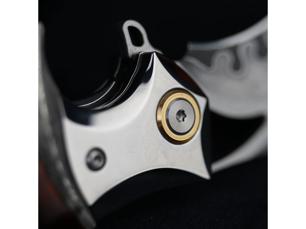 Rukojeť nože je z exotického dřeva Ironwood, které je příjemné na dotek a zároveň poskytuje luxusní vzhled. Kovové detaily, masivní bolster pro pevné a jisté uchopení a stylový přívěsek ve tvaru lebky dodávají noži jedinečný charakter.