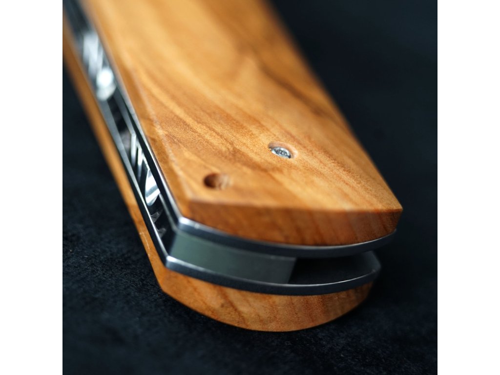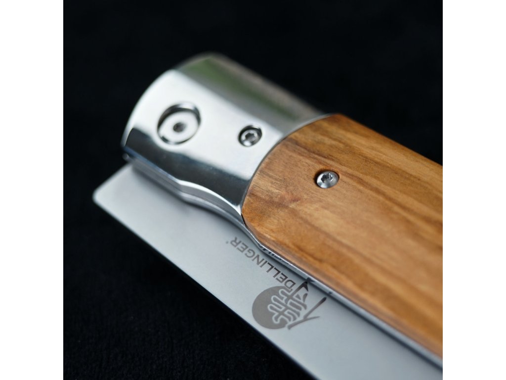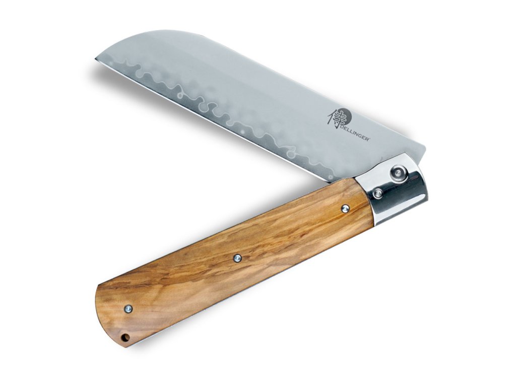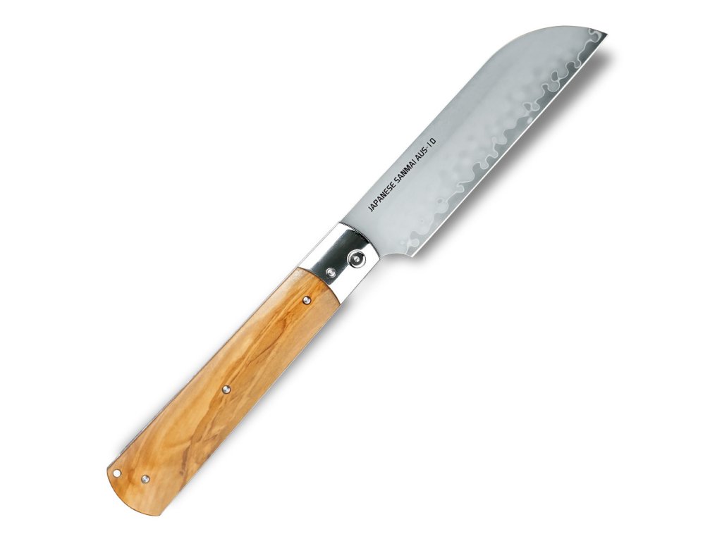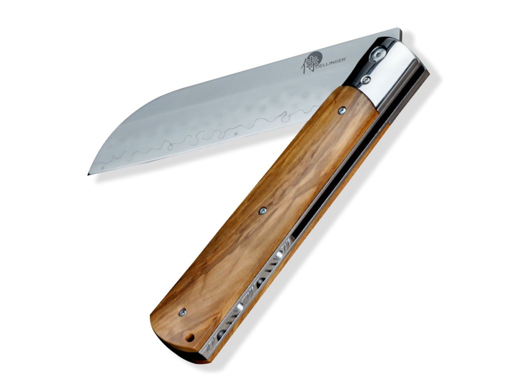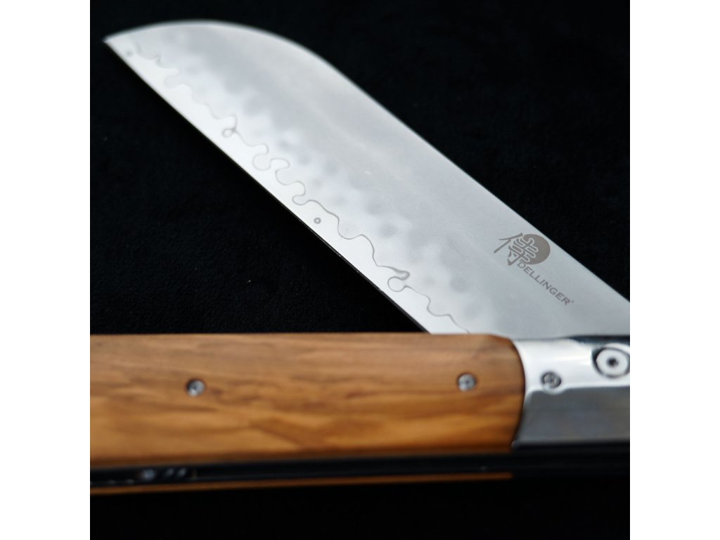 Zavírací nůž Santoku Dellinger Olive Guillotine s jádrem z oceli AUS-10 vloženým mezi 6 vrstev 2 nerezových damaškových ocelí (Sanmai) a střenkami z olivového dřeva. Masivní kování a pojistka proti samovolnému zavření. Délka ostří 140 mm.
