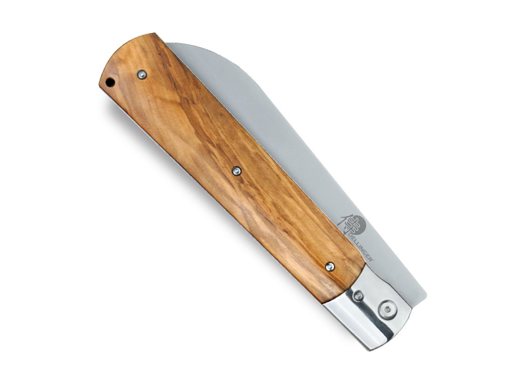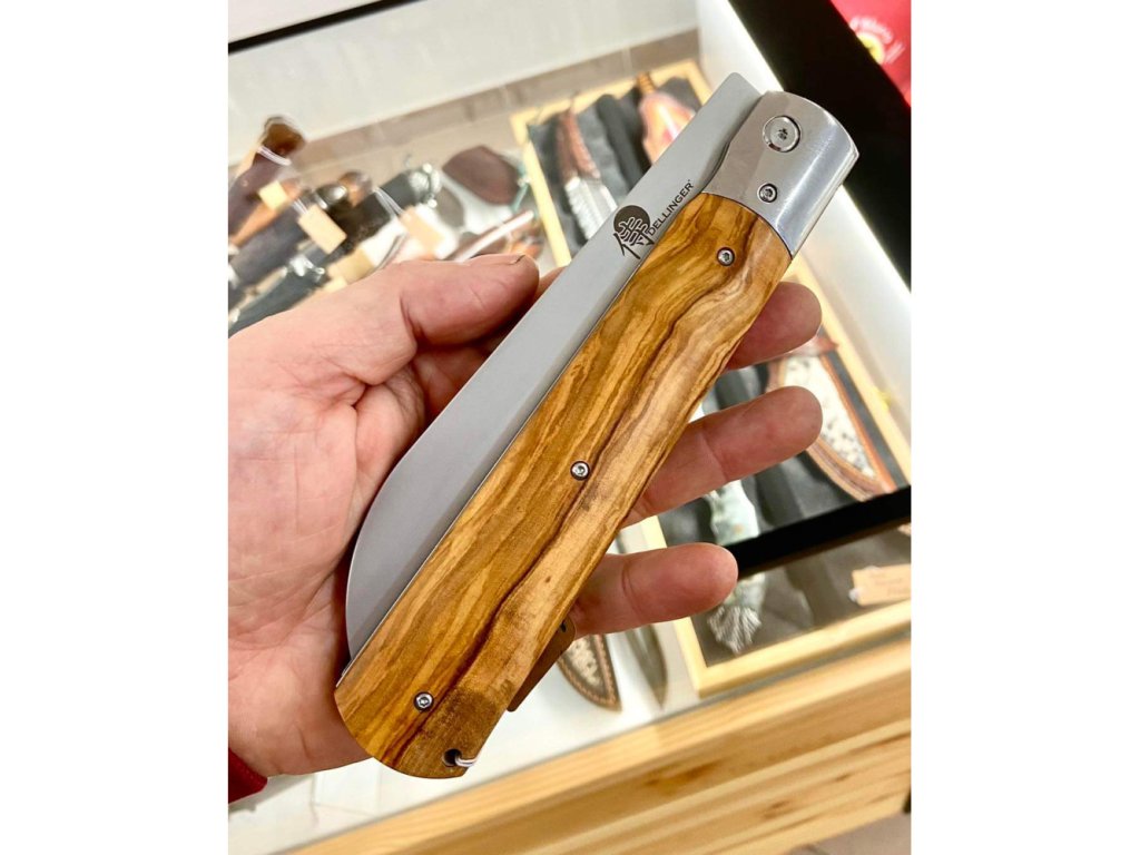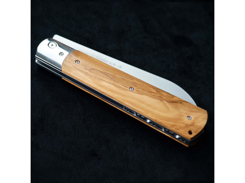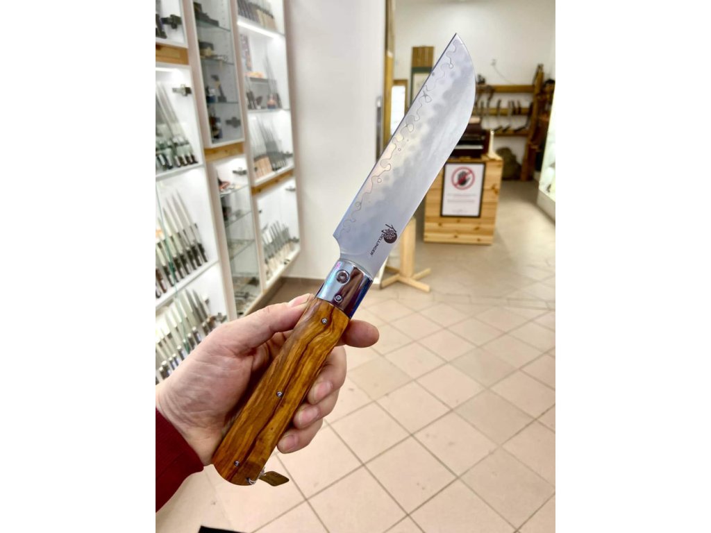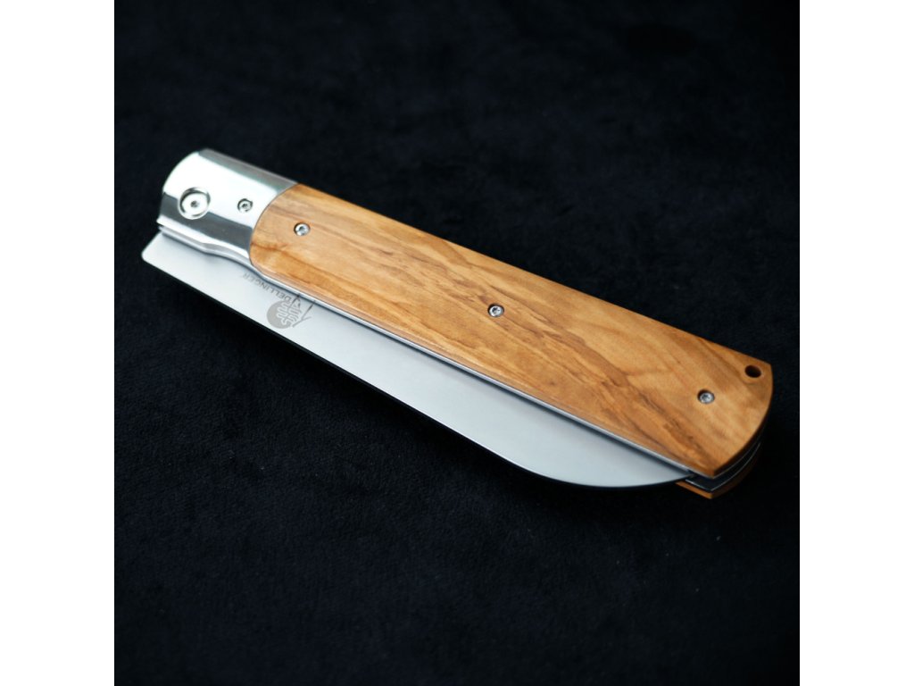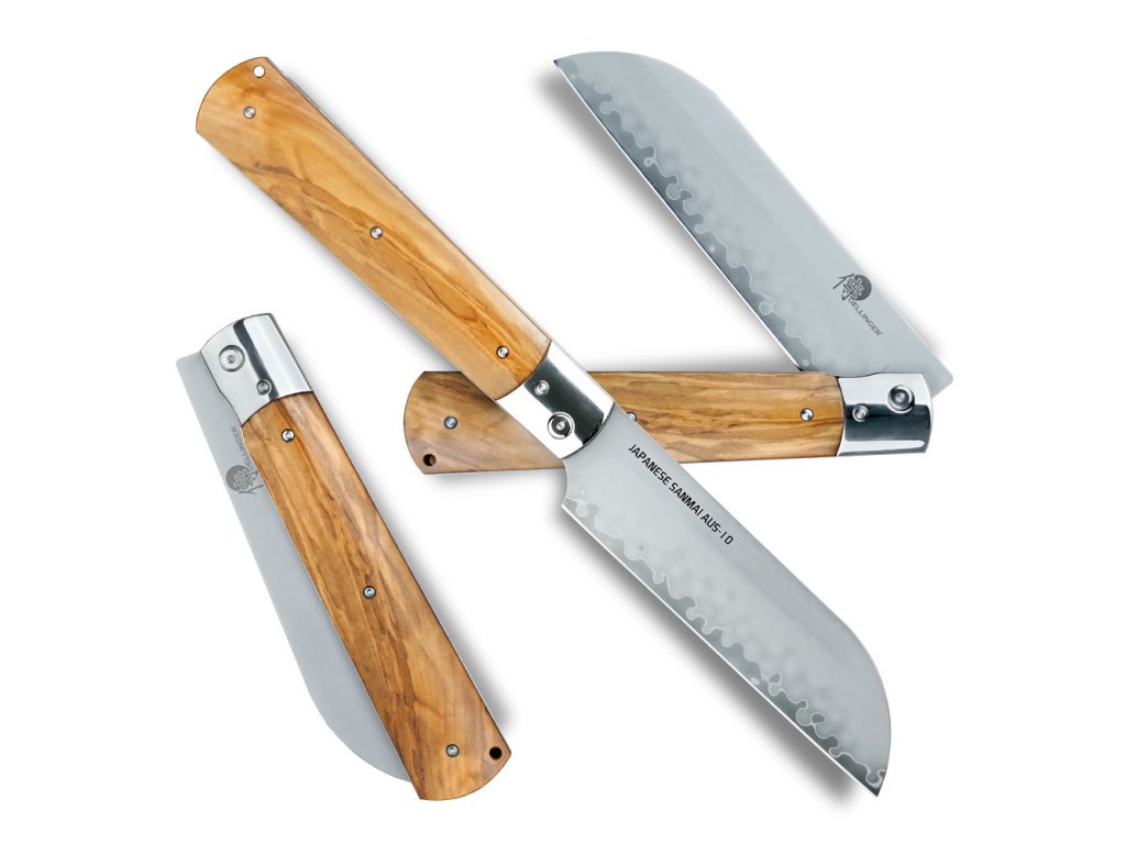 Zavírací nůž Santoku Dellinger Olive Guillotine s jádrem z oceli AUS-10 vloženým mezi 6 vrstev 2 nerezových damaškových ocelí (Sanmai) a střenkami z olivového dřeva. Masivní kování a pojistka proti samovolnému zavření. Délka ostří 140 mm.