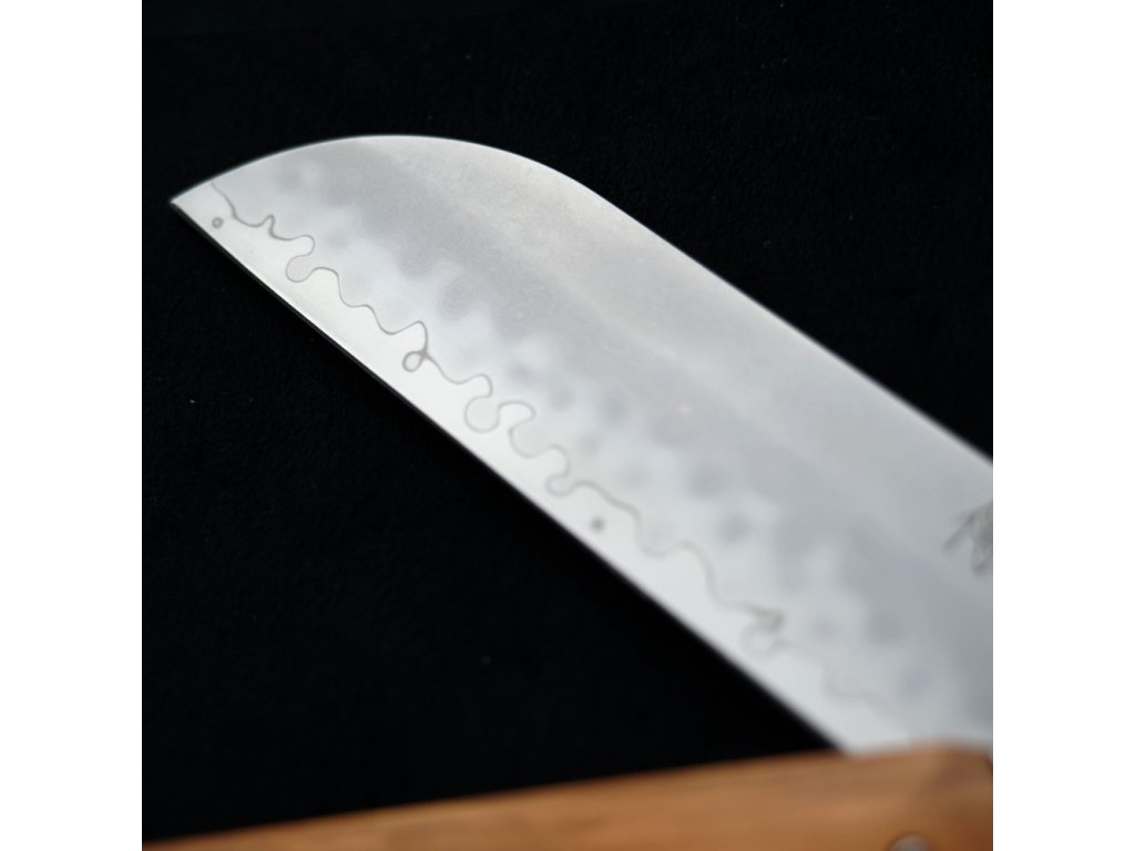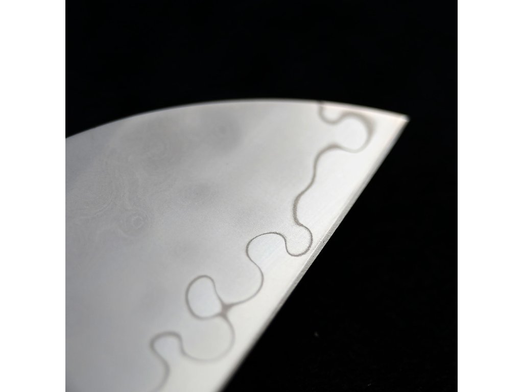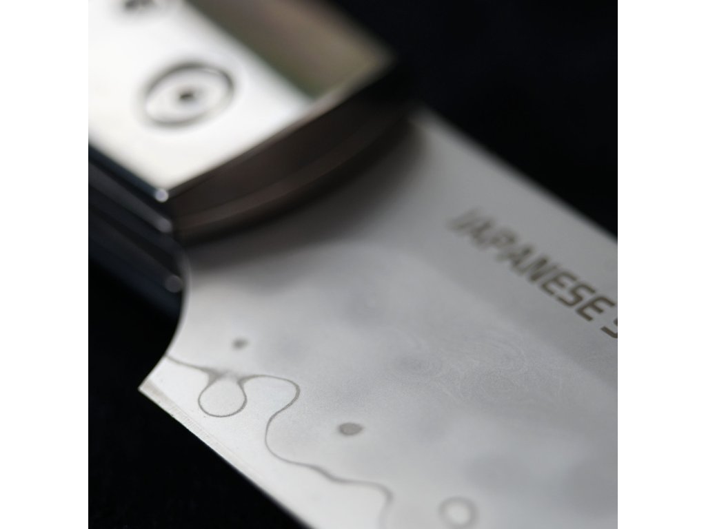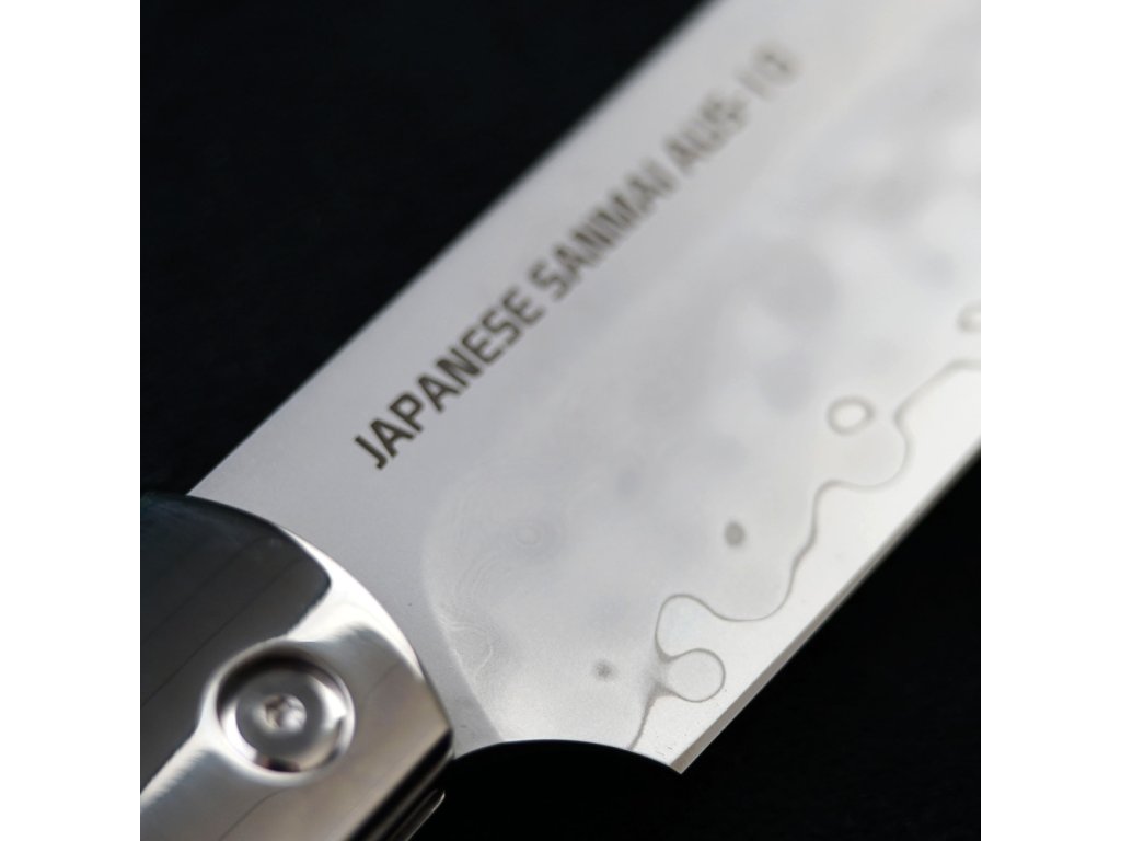 Praktický outdoorový zavírací nůž Santoku se stane věrným partnerem každého milovníka života v přírodě. Nabízí velmi ostrou čepel z japonské oceli AUS-10 Sanmai, které je velmi dobře chráněno proti korozi. Japonská ocel AUS-10 má dlouhotrvající ostrost při tvrdosti R60 +/- 1 Rockwella. Jádro z japonské oceli AUS-10 je vloženo mezi 6 vrstev 2 nerezových damascénských ocelí (damascus steel), které zajišťují mimořádnou odolnost a houževnatost.