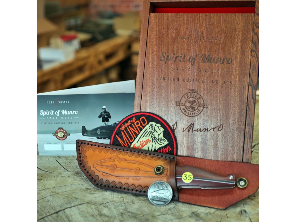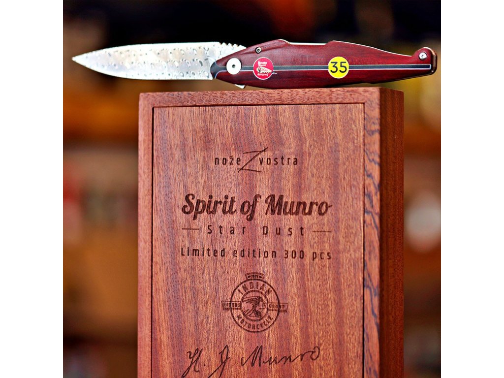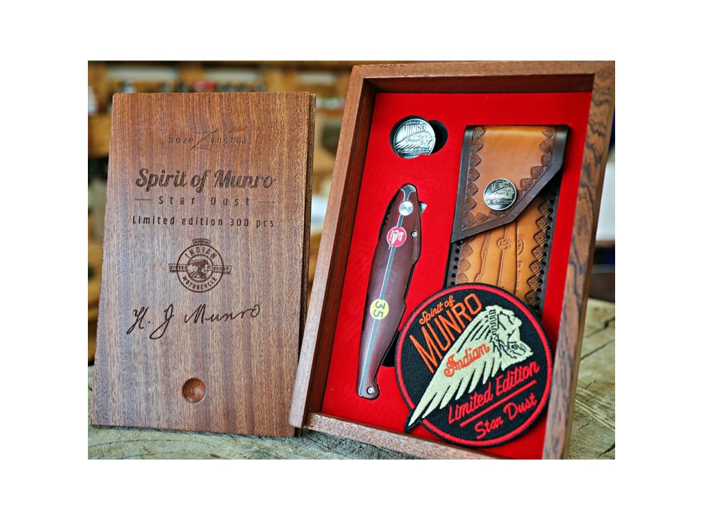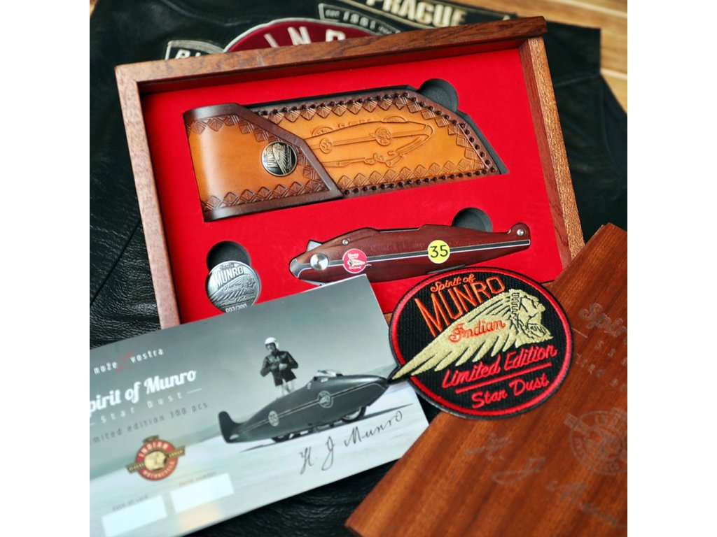 Limitovaný nůž Spirit of Munro – Star Dust vznikl jako pocta legendárnímu jezdci Burtu Munrovi. Každý ze 300 kusů této edice odkazuje na jeho slavný rekord na motorce Indian. Čepel z damaškové nerezové oceli bez jádra je osazena na keramických ložiskách s pojistkou liner lock. Rukojeť z červeného dřeva Redwood nese slavné číslo 35. Nůž je dodáván v palisandrové dárkové krabičce s koženým pouzdrem, kovovým odznakem, nášivkou a certifikátem pravosti.