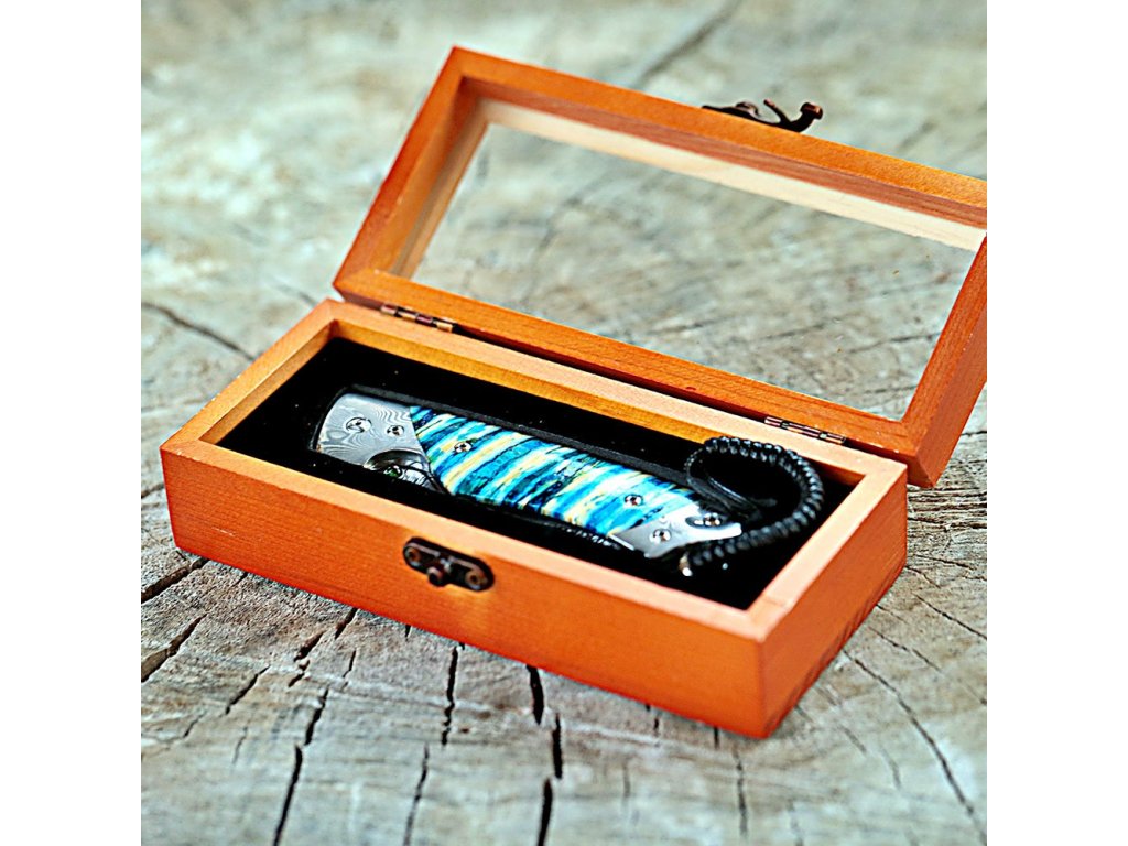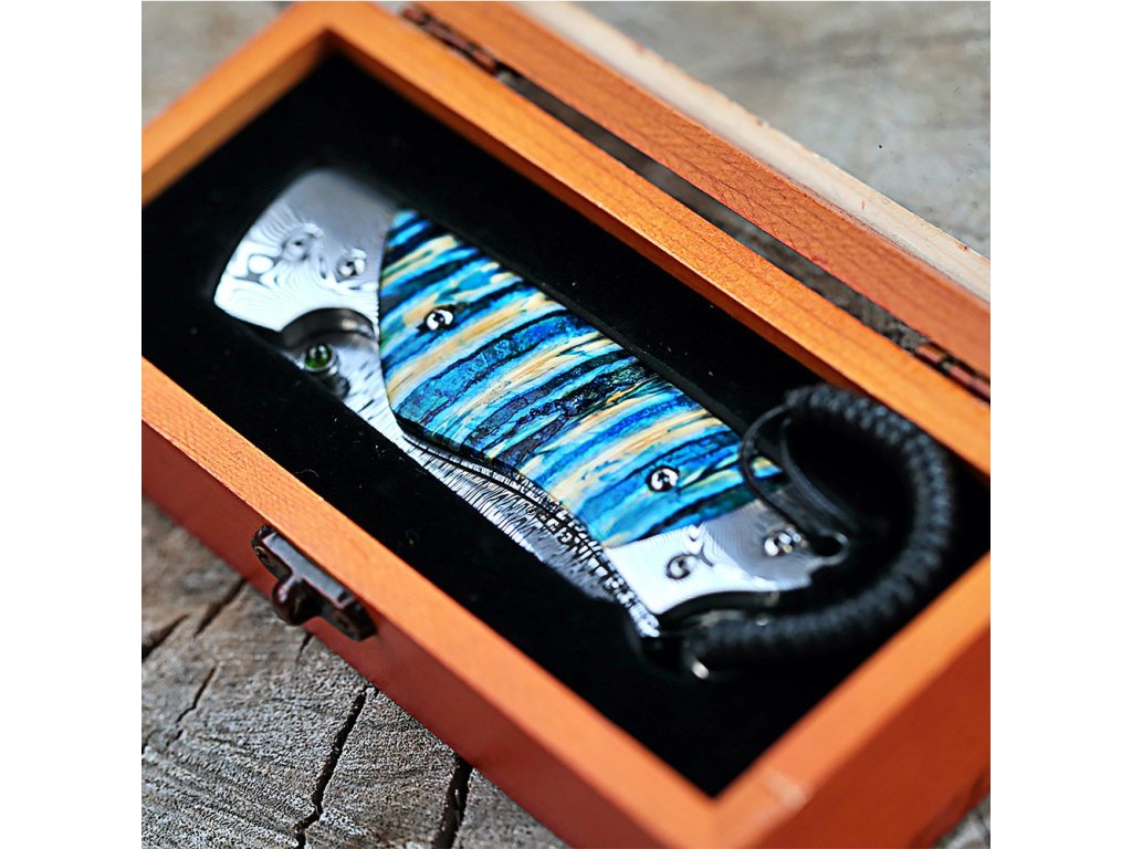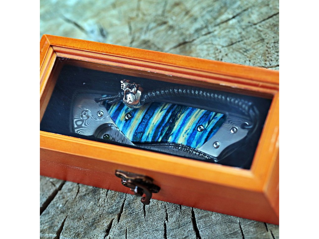 Elegantní zavírací nůž Dellinger Angriperen má čepel ze švédské práškové oceli RWL34. To je vysoce kvalitní nerezová ocel. Díky její tvrdosti je nůž mimořádně ostrý po dlouhou dobu. Také je velmi odolná proti opotřebení. Jedná se o plně použitelný lovecký nůž, který může být dokonalým dárkem pro každého lovce či myslivce. Rukojeť je ze vzácné mamutí stoličky různých barev, bolstr je z lesklé nerezové oceli. Na konci je otvor pro paracord s provlečenou koženou šňůrkou s příveskem lebky. Rukojeť má tvar, který ideálně padne do každé ruky. Nůž dodáváme v krásné dřevěné krabičce.