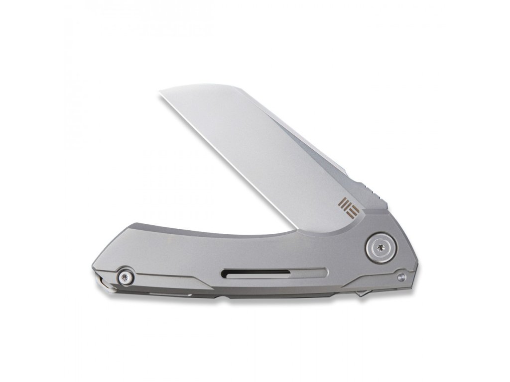 We Knife Mini Buster Silver je perfektní EDC nůž s čepelí z nerezové oceli CPM 20CV s povrchovou úpravou polish bead blast, použitá na čepel, dosahuje tvrdosti kolem 60 HRC, díky tomu vydrží ostří dlouho ostré. Dále je velmi odolná proti korozi, proto je možné nůž používat i v náročných podmínkách. Čepel typu Sheepsfoot znamená, že čepel má tupý hřbet pro bezpečné uchopení čepele prsty a následnému preciznějšímu řezu. Díky keramickému kuličkovému ložisku a flipperu otevřete nůž snadno jednou rukou, pojistka framelock zajišťuje bezpečné použití nože bez samovolného zavírání. Dobře tvarovaná rukojeť je vyrobená z titanu 6AL4V. Na její pravé straně je kapesní klips. Nůž je dodávaný s nylonovým pouzdrem.