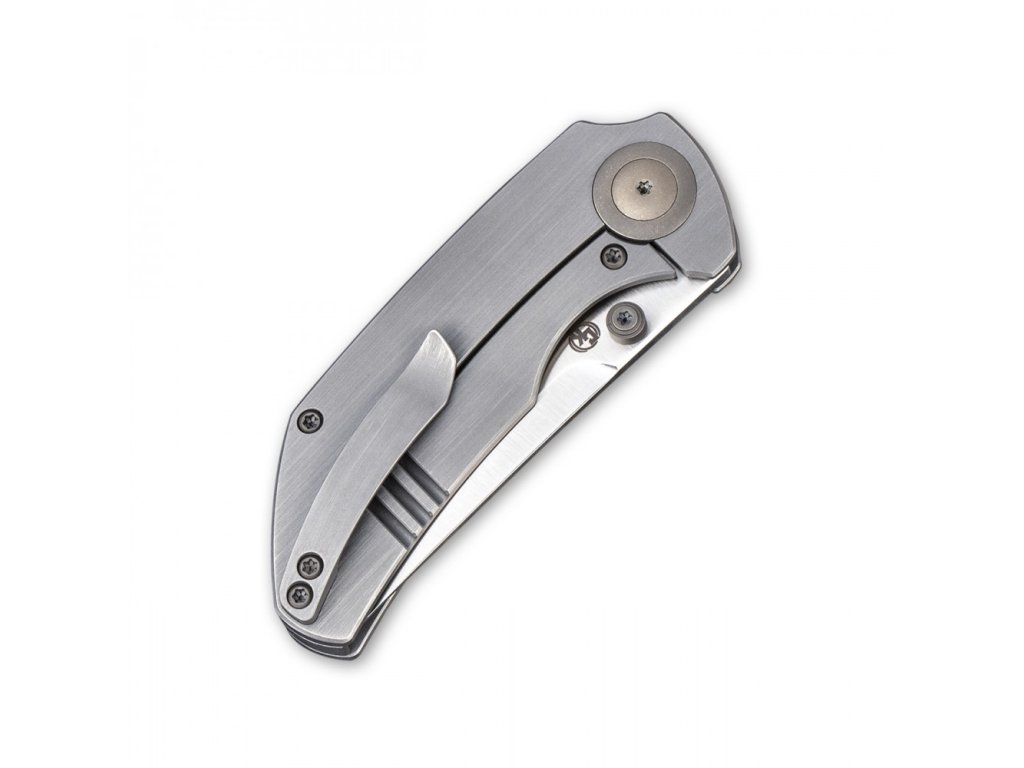 Hladký a bleskový chod otevírání zajišťuje keramické kuličkové ložisko, zatímco integrovaná pojistka framelock garantuje maximální stabilitu a bezpečnost při práci. Ergonomicky tvarovaná rukojeť je vyrobena z vysoce kvalitního titanu 6AL4V v elegantním šedém provedení. Na pravé straně se nachází diskrétní titanový kapesní klips. Tento EDC nůž je dodáván s ochranným nylonovým pouzdrem.