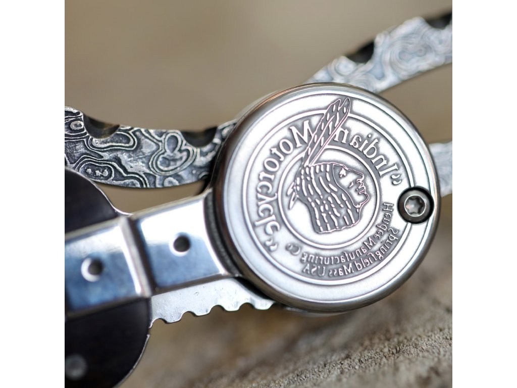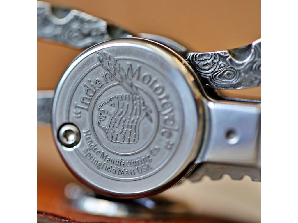 Zavírací nůž zVostra Indian Pírko s čepelí z damaškové oceli a rukojetí z ebenového dřeva. Design inspirovaný motorkami Indian, dodávaný s koženým pouzdrem.