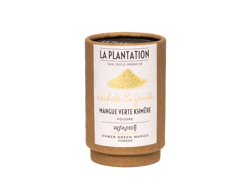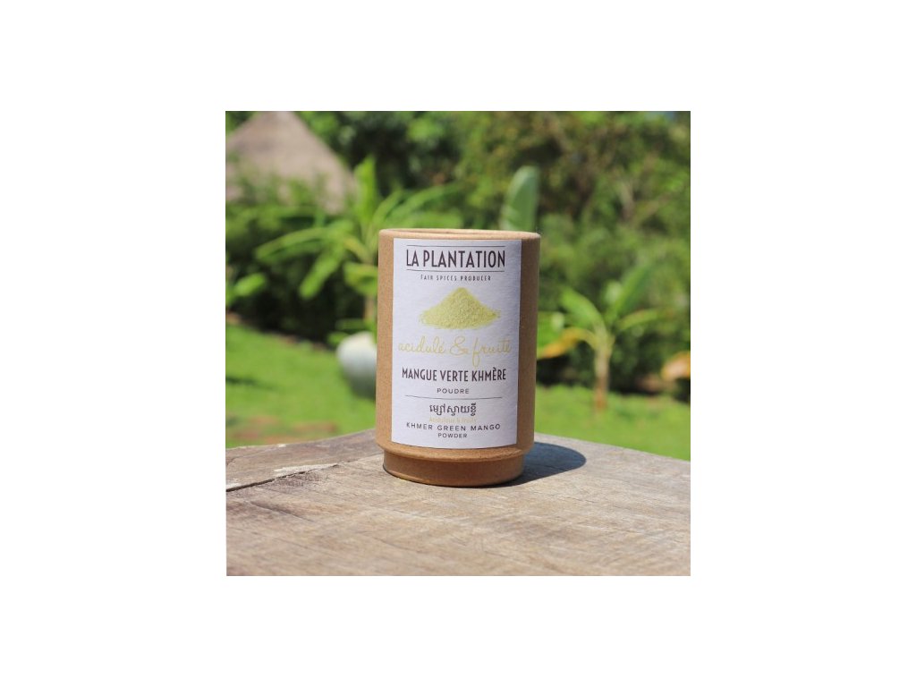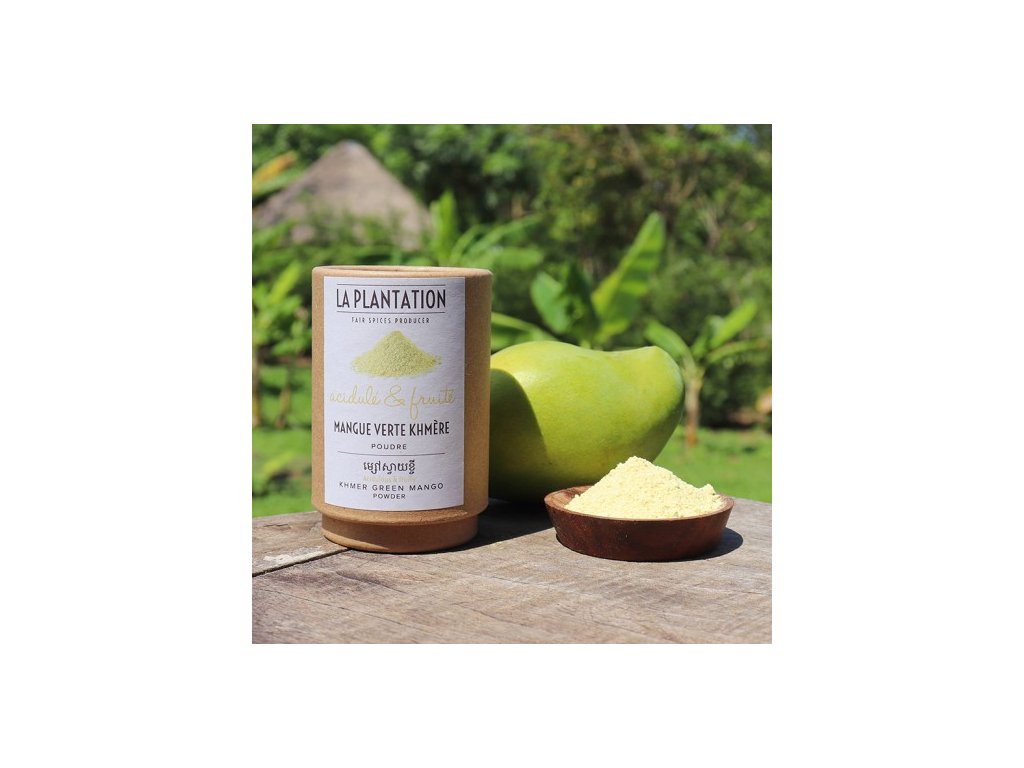 Mleté zelené mango - typický ovocný strom regionu Kampot, pěstovaný přímo na farmě La Plantation v podobě jemného prášku. Bez chemie, pesticidů a hnojiv - čistý přírodní produkt nejvyšší kvality.
